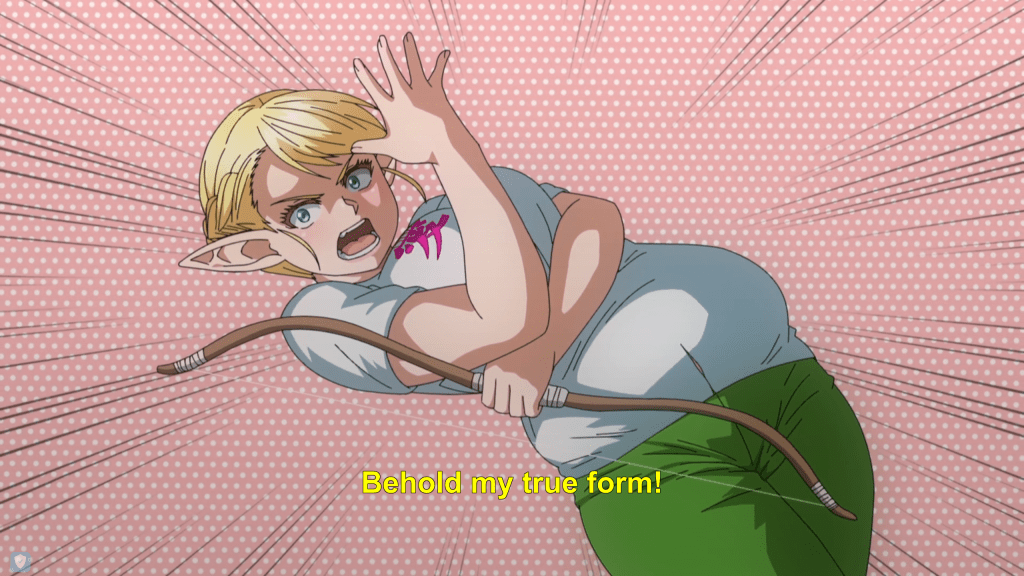This is NOT the way I wanted to spend my weekend guys. I just wanted to relax after a hard week of work and watch some decent anime premieres…maybe even write some insightful commentary. But along comes Plus-Sized Elf with its absurd fanservice and mediocre plot and says “Hold my french fries.” This show is the animated version of a pile of Snickers; absolute junk food with no redeeming nutritional value. Yeah, it might scratch an itch for someone, but dearest gentle reader, that someone ain’t me. Two minutes and thirty seconds into this show, our title character pulls off her shirt revealing her breasts for all to see. Why? Because that’s all this show has going for it: fanservice and fetish pandering. This show is out there for shock value and titillation and has more than earned its TV-MA rating. It comes in, flashes some boobs, gives plenty of fanservice shots, and leaves. It’s not even a full-length episode, just barely clocking over eleven minutes with the ending title sequence. And speaking of the ending title—that was a mess. An absolute MESS.