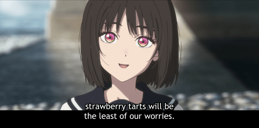 *A “grimmer” version of Hyouka? Well, that’s to be expected when the source material was written by Hyouka’s author, Honobu Yonezawa, and the episode was directed by Mamoru Kanbe (Elfen Lied, The Promised Neverland), as Twitter explained to me after this review dropped.