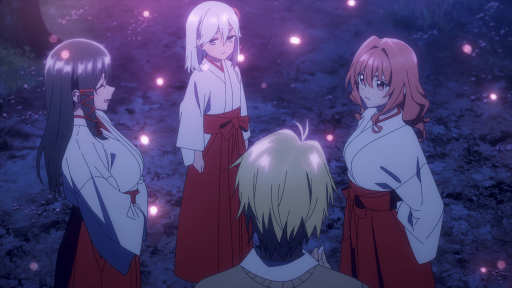 Life has been hard for 17-year-old high school student Uryu Kamihate. Having grown up in an orphanage after losing his mother to illness, Uryu is determined to make it into the top medical school in Japan, and as such decides to live at a shrine in Kyoto to focus on his studies, even though he no longer believes in gods and miracles. Upon arriving at Amagami Shrine, Uryu accidentally walks in on the three shrine maidens, undressed of course, and it goes about as expected—they call him a pervert and kick him out. Creativity? What is that? After resolving the misunderstanding, we are formally introduced to the titular Amagami sisters: big sister Yae, little sister Asahi, and middle child and typical tsundere Yuna. Of course, Yuna and Uryu get along like oil and water in the beginning—the two clashing over stereotypical perverted moments and their various beliefs (or non-beliefs in Uryu’s case), but after a few shenanigans involving a missing hair tie, the two reach an understanding and make nice. Of course, it’s revealed at the end of the episode in a post-credits scene that the priest in charge of the shrine intends to have Uryu marry one of his granddaughters and take over the temple. Cue the shenanagins…I guess.