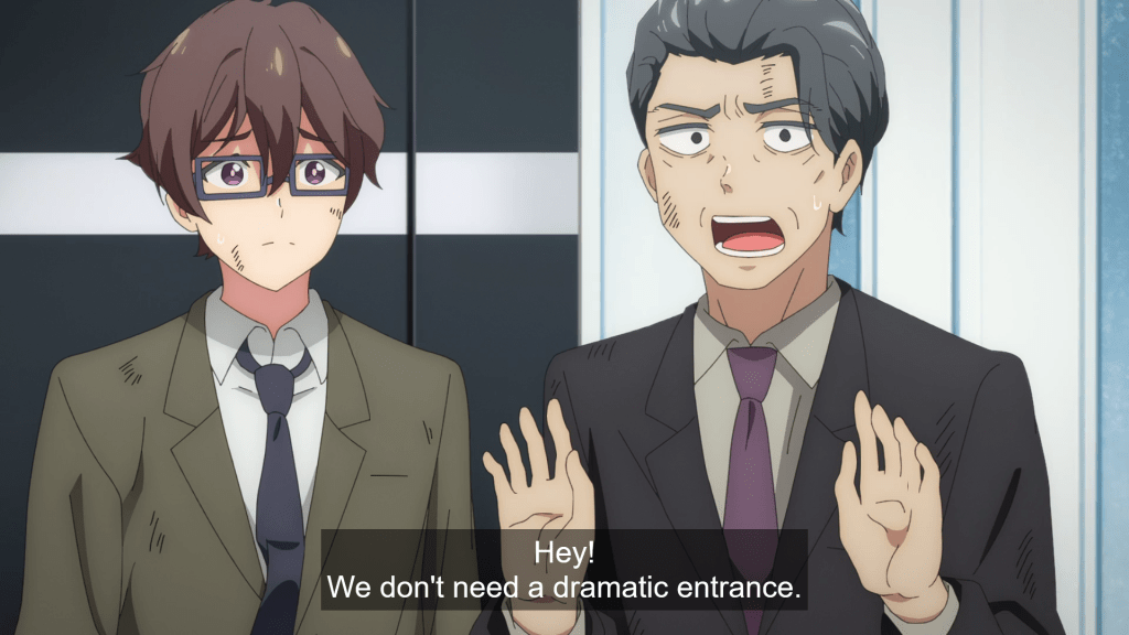 Episode one of Magilumiere is a mixed bag. There are hints here that this series could be lovely and special (and indeed, volume one of the manga is excellent), but the animation and storytelling aren’t smooth. The characters don’t always look great, with strangely angular faces in some scenes. But the original material does shine through the mediocre execution in certain spots, particularly in the world-building. I love certain aspects of the show, like the very idea of magical girl companies and this focus specifically on a small magical girl business. The things that worry Hitomi feel oddly familiar, like overwork and poorly designed technology. The tech, too, is fun, as the series seems to imagine the kaii as beasts with some sort of digital element; they’re attacked through powers connected to digital technology and secured through a device that’s a meeting of Ghostbusters‘ ghost traps and thumb drives. Speaking of the attacks, the melding of CGI with 2-D animation is up and down, mostly because the CGI is very realistic-looking and beautifully rendered (if dim) and it doesn’t always match up well with the traditional animation. The series looks best, though, when there’s a focus on the brightness of the fight scenes. The magical girl transformation scene in episode one looks similarly flashy, though Hitomi’s facial expressions and movements are awkward. One more thing—I like the shoot ’em up feel of the fights; to me, it adds another layer to the series that’s engaging, though again, the foibles in episode one might be enough that I’ll eventually leave this series behind. I hope not, because the manga is heartfelt and creative—and here’s hoping that goodness eventually shines through.