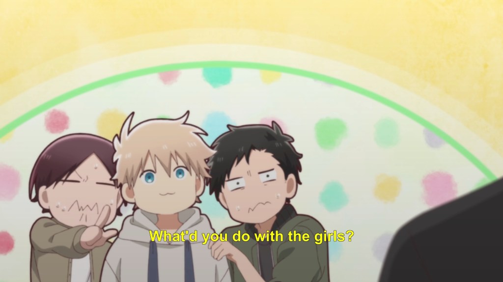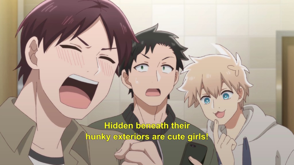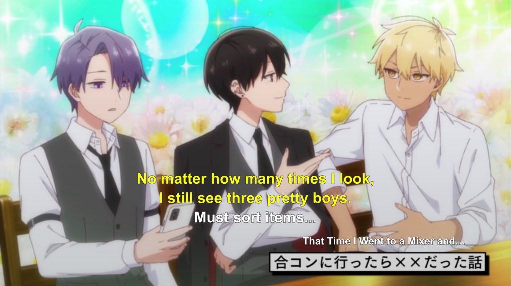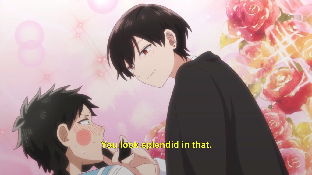 This episode is basically one gag repeated ad nauseam: “Watch the boys squirm as the girls make better ikemen (handsome men) than them! Tee hee!” The same visual gags play over and over again too, so that the animation quickly starts to feel a bit one note. But is it at least funny? Well, the premise has the potential to be, and the guys are pretty likable, making their confusion chuckle-worthy initially, but Suo’s seeming determination to make everyone around her uncomfortable while feigning obliviousness kind of ruins it for me. I don’t like the kind of humor that relies on someone being made a fool, and she’s definitely already started gaslighting Tokiwa. What about the other characters though? It’s hard to tell: so much time was dedicated to reiterating the central gag that we didn’t really get to know anyone beyond their single-word trope definition; you know, there’s the fujoshi (BL fan) (Fuji), the bashful one (Kohaku), the puppy one (Asagi), the plain one (Hagi), the tongue-tied ML (Tokiwa), and the sadistic FL (Suo). Stir in the “girls do everything better, even being men (especially Suo)” gag, and that’s your show! Could this be interesting? If the storytelling ever goes beyond the novelty of girls in drag, then sure, maybe it could. Why is Suo so aggressive? Does she use drag like armor, to boost her confidence around her crush? I have a feeling this is just a gimmicky use of drag for laughs, though, rather than something that will offer anything insightful on the subculture or gender more broadly. And since I don’t find it funny either, well, that’s it for me!