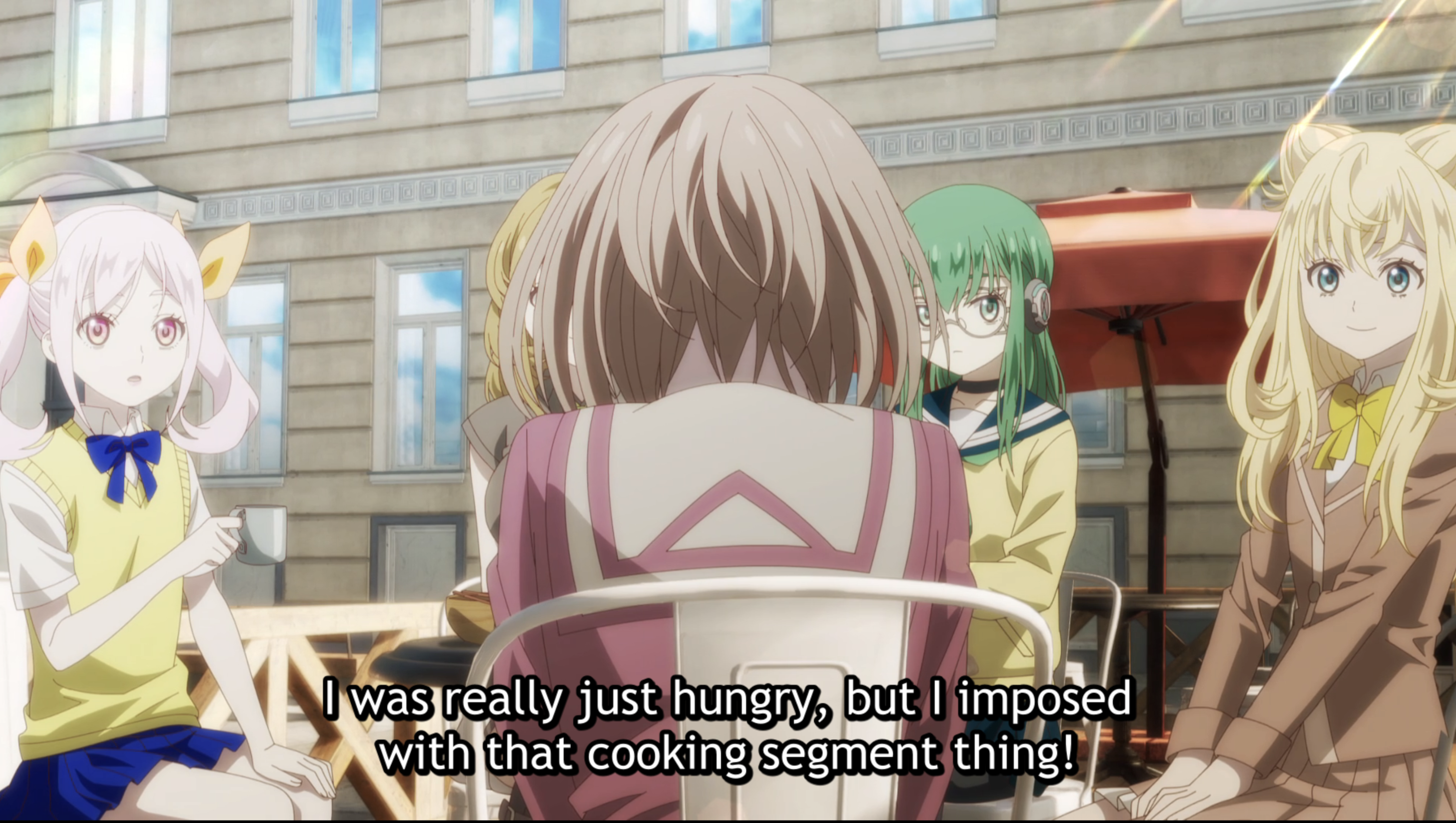 Studio GoHands is always going to come under fire [edit: ahem, see Josh below!!] for their OTT stylistics which come straight out of a Michael Bay movie, making every head of hair move like Medusa and every leisurely walk look like the stuff of a fever dream with its forced perspective and hyper-camerawork. But, you know, you gotta hand it to them: they’re original. And that’s definitely what this series is too, being a crazy mashup of genres with a healthy sprinkling of tropes, but enough unpredictability and downright wackiness to make it fun. It’s not the kind of episode you can predict, really, and there’s value in that. Also, the OP is a hoot and a half with those death metal screamo female vocals mixed in with uber-cutesy (English accented?) girly rap. Do I know what I just watched? Not really. Do I want to see a bit more? You bet! Especially that flying electric guitar surfboard that takes out giant human-erasing machine aliens! (Also, they’re cooking up Italian next episode, so gotta tune in for that.)