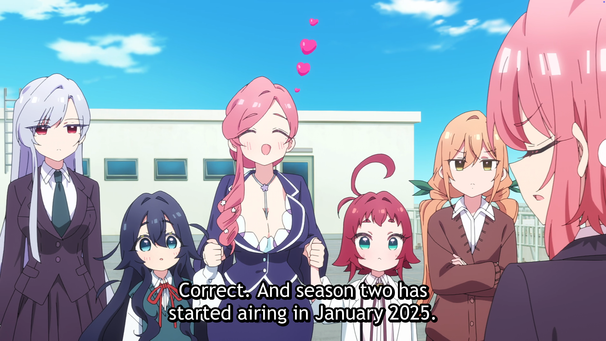 The 100 Girlfriends Who Really, Really, Really, Really REALLY Love You! (Season 2) • Ameku M.D.: Doctor Detective • Anyway I’m Falling in Love with You • The Apothecary Diaries, Season 2 • Aquarion: Myth of Emotion • Ave Mujica – The Die is Cast – • Babanbabanban Vampire • Bogus Skill <> ~About that time I became able to eat unlimited numbers of Skill Fruits (that kill you)~ • The Daily Life of a Middle-Aged Online Shopper in Another World • Dr. Stone: Science Future • Even Given the Worthless “Appraiser” Class, I’m Actually the Strongest • Farmagia • Fate strange Fake • Flower and Asura • From Bureaucrat to Villainess: Dad’s Been Reincarnated! • Headhunted to Another World: From Salaryman to Big Four! • Honey Lemon Soda • I Left my A-Rank Party to Help My Former Students Reach the Dungeon Depths! • I May Be a Guild Receptionist, But I’ll Solo Any Boss to Clock Out on Time • I Want to Escape from Princess Lessons • I’m a Noble on the Brink of Ruin, So I Might as Well Try Mastering Magic • I’m Getting Married to a Girl I Hate in My Class • I’m Living With an Otaku NEET Kunoichi!? • Magic Maker: How to Make Magic in Another World • Medaka Kuroiwa Is Impervious To My Charms • Medalist • Momentary Lily • My Happy Marriage • Okitsura: Fell in Love with an Okinawan Girl, but I Just Wish I Know What She’s Saying • Possibly the Greatest Alchemist of All Time • Promise of Wizard • The Red Ranger Becomes an Adventurer in Another World • Sakamoto Days • Solo Leveling Season 2: Arise from the Shadow • Sorairo Utility (TV) • Tasokare Hotel • Übel Blatt • Welcome to Japan, Ms. Elf! • Yu-Gi-Oh! Go Rush!! • Zenshu