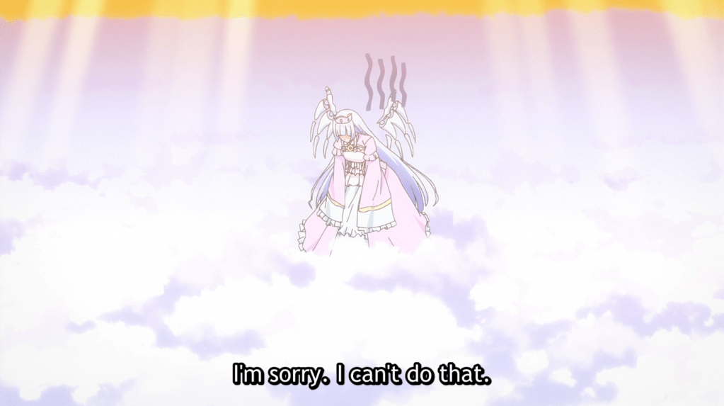I think the production quality is up to standard in terms of animation, voice acting, and soundtrack. The art style is a bit generic though, and the video game menus look bland. But the things I’d criticize the most about this first episode are the story and the characters. The first five minutes are nothing more than Takumi speaking with Norn amid the clouds of a heavenly realm. During this time, we learn basically nothing about Takumi, and it doesn’t help that he has no physical body during the conversation. Norn is not interesting enough to carry the scene either, and this sets the stage for a mediocre first episode. The rest is moderately entertaining, as we see Takumi gain new skills. Still, it feels kind of meaningless if there are no interesting characters for him to interact with. Some of the foreshadowing in the first episode suggests that the story might take a different direction soon, so if you’re not too bothered by the first episode, it might be worth sticking around for an episode or two more. However, because of the unoriginal premise and uninteresting characters, I won’t be watching any more of this anime.