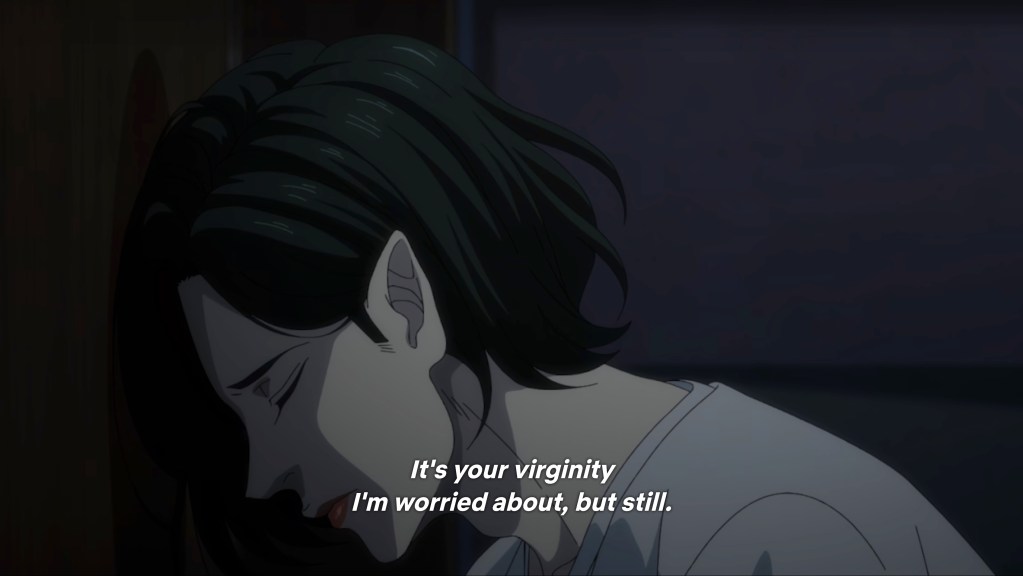 Yikes, that was worse than I feared! I expected some heavy-handed romanticization and scenes of sexual tension from this BL set in a bathhouse and centering on vampires, but I did not see this unabashed “comedic” treatment of pedophilia coming. The lingering shots of Mori’s tented pants were also rather surprising, as well as the subtitles’ use of the f-word. Most disturbing of all though is Mori’s repeated clarification that he does not care in the least for the boy, he just wants to satisfy his (blood and other kinds of) lust on him; he only wants his body and blood. Maybe all this blunt sexual commodification of a minor is meant to be the starting point for a profound character arc for Mori, but somehow, I doubt it. Instead, it’s being played too much for “comedy” in both the animation style (solid animation, by the way! Very pretty to watch with clear shoujo touches) and the profusion of weak attempts at humorous one-liners in Mori’s internal voice. If Mori didn’t exist in this series, the rest of the setup could be mildly interesting: Rihito catches the baleful gaze of a gyaru that first day too, and generally seems to be a pretty sweet kid. I’d probably watch his love story unfold, actually, but not as long as Mori remains not only in the picture, but the main focus of the series. So there we have it! If you’re looking for a BL romance or comedy, keep looking; this one is neither. Gonna go sweep out my Netflix account now and get rid of the bad taste left in my queue.