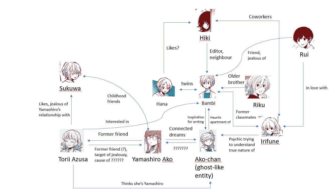 With mangaka HERO’s character relationship chart in hand, I navigated Ako and Bambi with confidence for the first time in volume four. Until now, the series has been confusing for me because I just can’t get a tab on who these characters are besides the titular duo and Ako’s “real” self, Yamashiro. It’s a shame, because the series is illustrated in such a charming manner—eight panels per page featuring cute character design and in a simple style reminiscent of older newspaper comics, but with just a touch of color added. It’s also sweet and increasingly thoughtful; this volume, for instance, explores Ako’s true nature further and dives right into the unexpressive Bambi’s feelings for Ako, while adding further depth to virtually all of the other characters. But Bambi and Ako receive especially strong treatment in volume four from HERO, who makes Ako more complex than just the positive, excitable girl she appears to be, Bambi more than the “go with the flow” character he is on the surface, and Yamashiro more emotional than she’s willing to let on in front of others. Volume four is also exciting because the fated meeting between Ako’s two halves draws nearer and nearer. But alas, I can’t keep track of all these similar-looking characters—at least that’s how I felt until using that illustration. It helped so much! I could more fully enjoy this wonderful series as I referred back to the chart and drilled these characters into my mind. Hallelujah! If you’ve struggled in that arena like I have, I strongly recommend you keep the chart handy—it’ll help you understand and enjoy this otherwise wonderful, wonderful manga. ~ Twwk