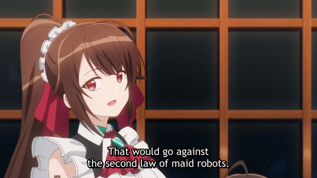 Yes, there’s A.I., though even a robot story, which I tend to love, couldn’t help episode one of I’m the Evil Lord of an Intergalactic Empire!, which wrapped with me giving the biggest eye roll of all time. Random fanservice, a staid storyline, and a downfall so over-the-top and unbelievable that I almost checked out right then and there, all had me ready to immediately declare this a series to stay away from. But then episode two streamed on autoplay afterward. While I’ve been in the contingent expressing derision toward double-episode premieres, in this case, it was necessary because of the tonal and thematic shift in episode two. Following Liam on his 5th birthday in this world and the days that followed, episode two shows him once again getting the shaft, but it also shows him solidifying his new credo and transforming from a self-sacrificing, loving, and meek man in his first life, to a selfish, evil figure in the second. But it’s really the tone of episode two that turned me: it’s much lighter than the first, featuring quite a lot of humor (some of it sexual) and giving hope that this series will be more than your basic revenge tale, which, at its worst, is both overly simple in form and script, and an encouragement for the audience to support terrible thoughts and deeds. For instance, Amagi—the A.I. maid that Liam’s parents order for him—is a robot that supports Liam in his quest for revenge, but whose ideas and actions support her master in a way that resembles love. The two even talk about human emotions for a short time. In light of this, short conversations from the first episode between the now-older Liam and his crew, which at first just seemed to point toward an “evil girl harem,” now seem to indicate more than skin-deep reasons for the loyalty they have toward the count—and which will certainly be explored in future episodes.