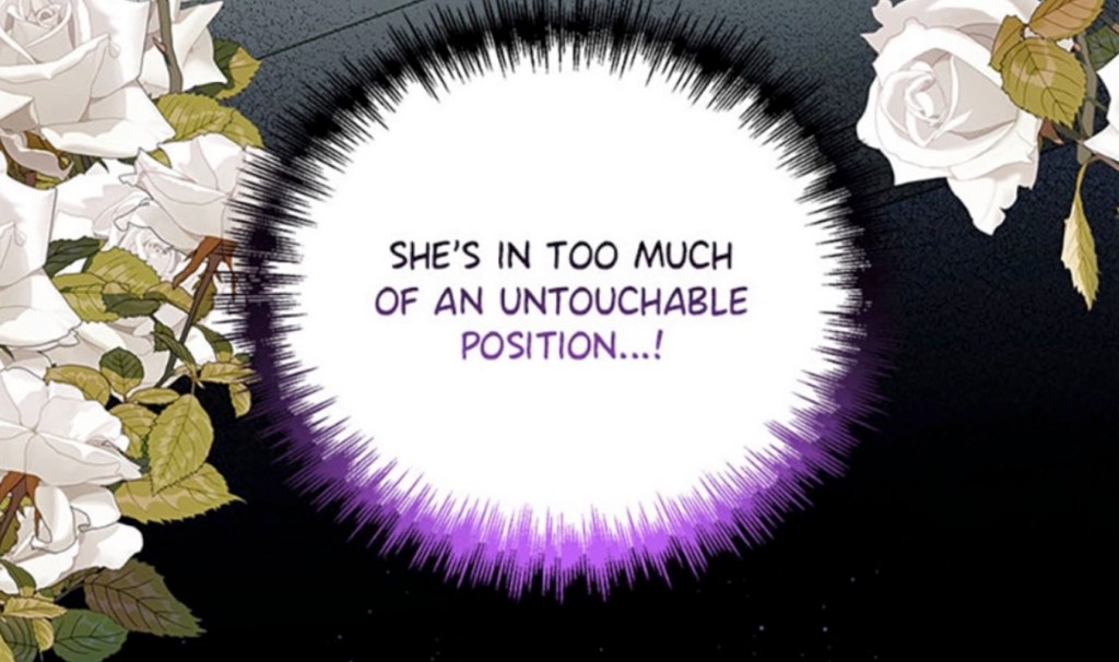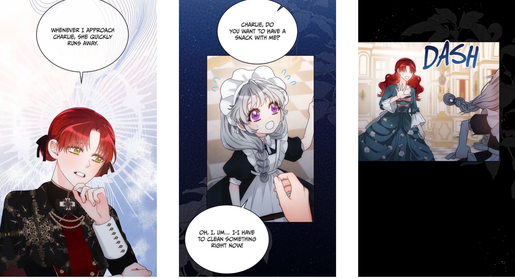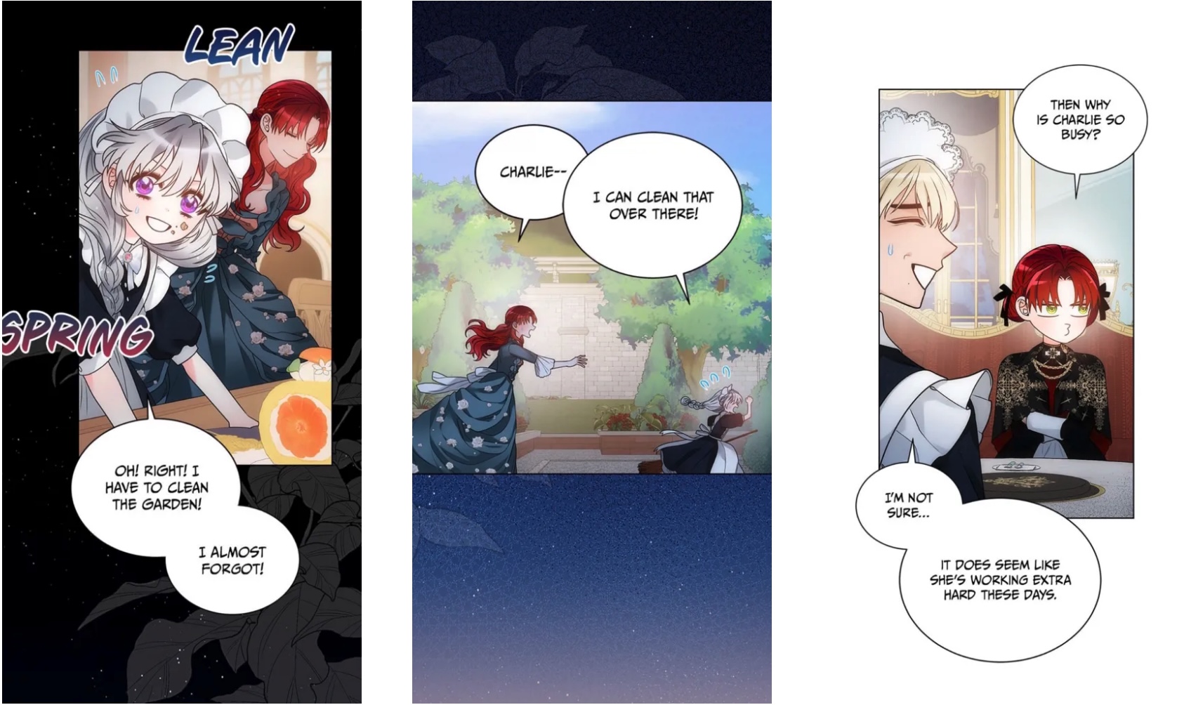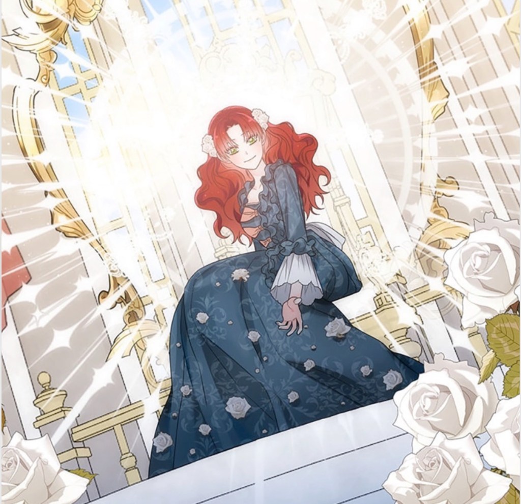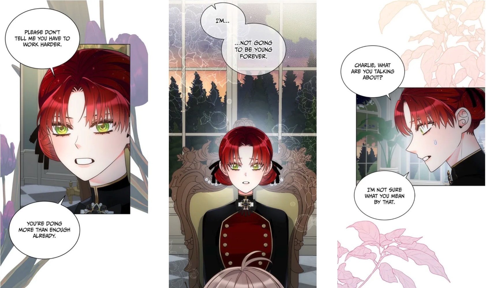 Desperate, she turns to her friend the imprisoned prince (because manhwa) and his wise counsel, honed over eight entire years of existence (mostly spent in seclusion). “If you were keeping someone around because you like this person for a specific reason, and that reason went away one day…what do you think you’d do?“ she asks. Never one to mince words, the prince points out that her question is pretty weird. After Charlie presses him for an answer, though, he concedes that he’d “naturally grow more distant from that person…” Shot to the heart! Charlie is convinced that she too will be rejected and alone once again—unless… And that’s when it hits her: surely, she can earn dear Rose’s affection; she can give the Empress another reason to love her, if only she works hard enough to make herself useful.