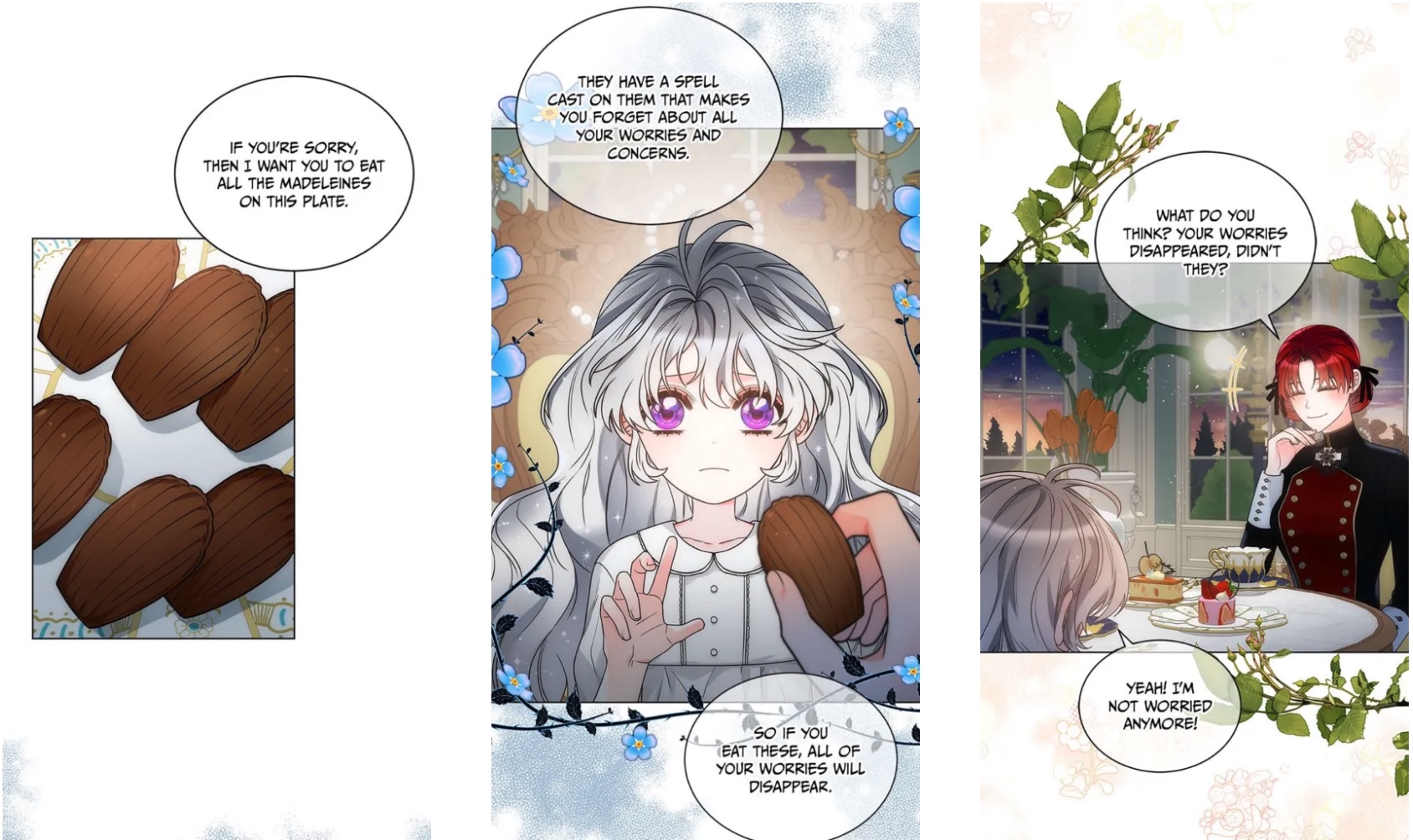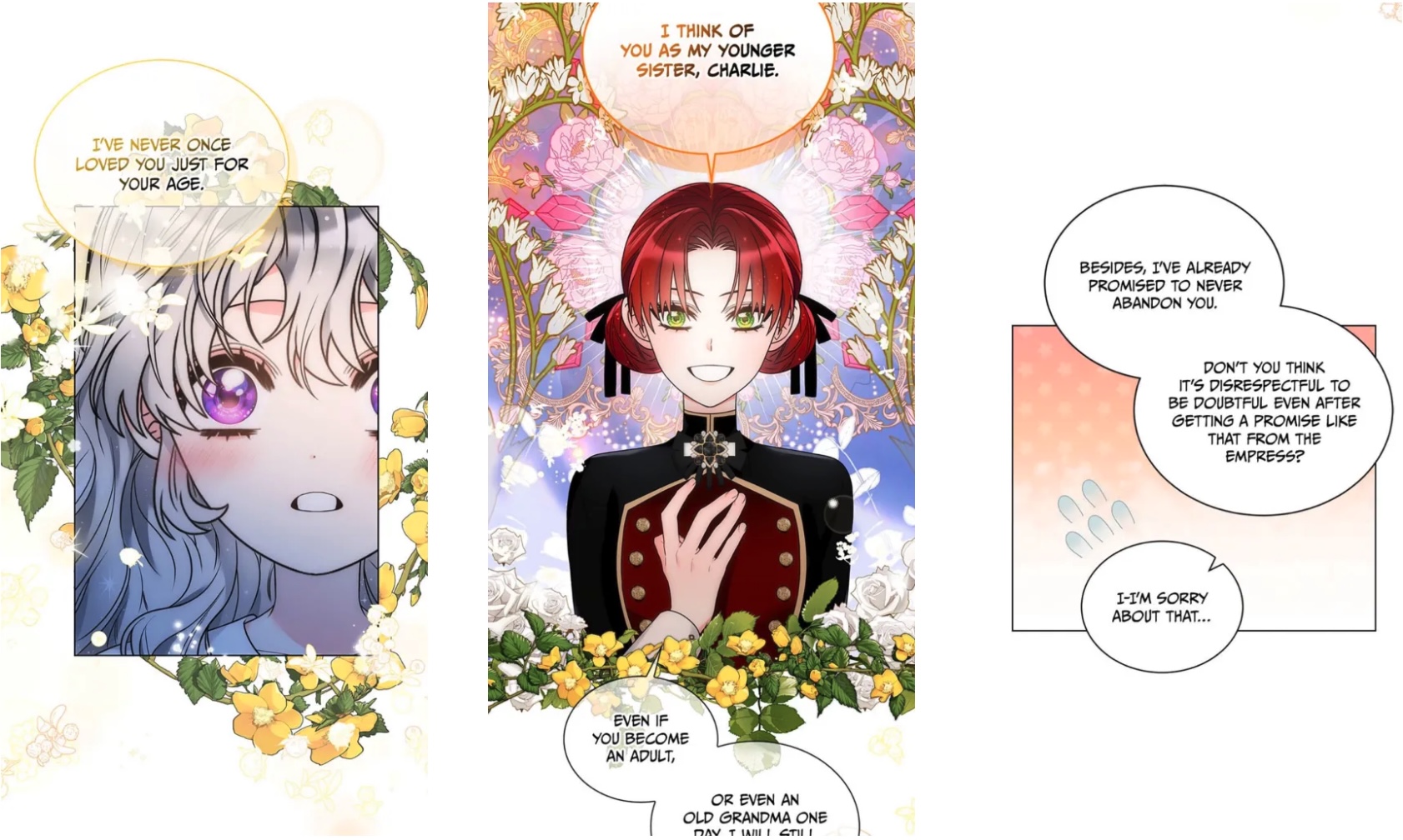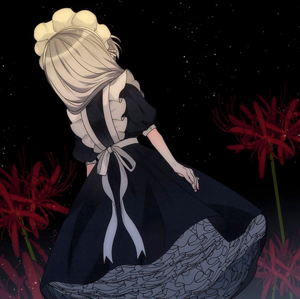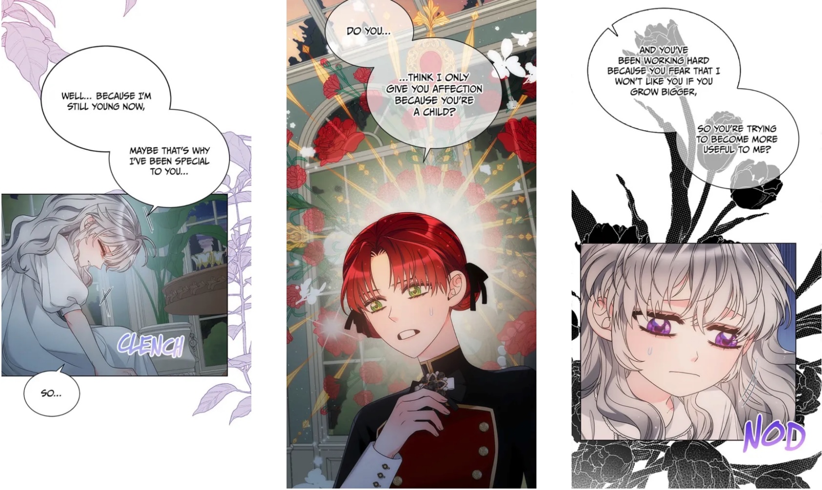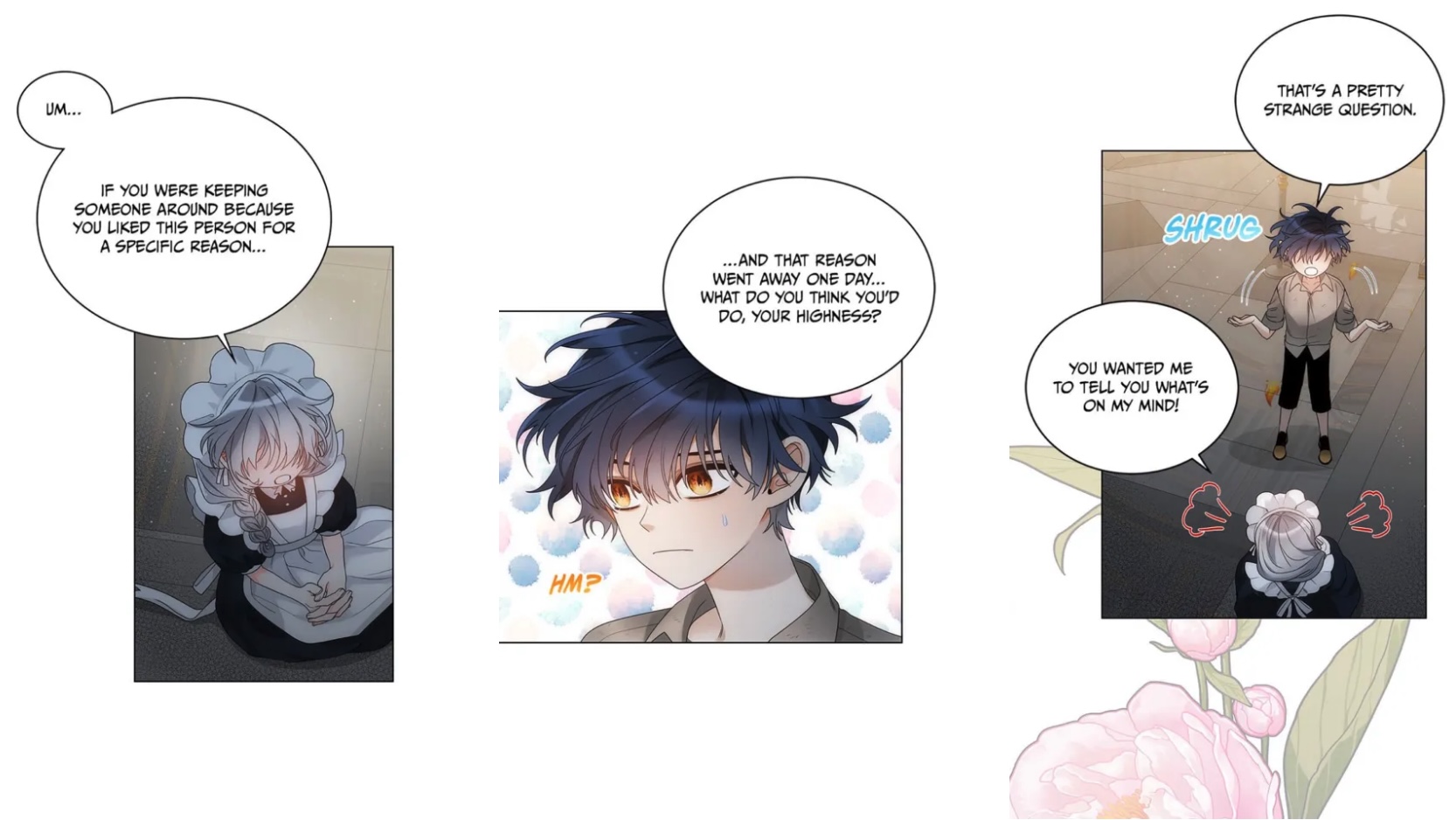 Desperate, she turns to her friend the imprisoned prince (because manhwa) and his wise counsel, honed over eight entire years of existence (mostly spent in seclusion). “If you were keeping someone around because you like this person for a specific reason, and that reason went away one day…what do you think you’d do?“ she asks. Never one to mince words, the prince points out that her question is pretty weird. After Charlie presses him for an answer, though, he concedes that he’d “naturally grow more distant from that person…” Shot to the heart! Charlie is convinced that she too will be rejected and alone once again—unless… And that’s when it hits her: surely, she can earn dear Rose’s affection; she can give the Empress another reason to love her, if only she works hard enough to make herself useful.