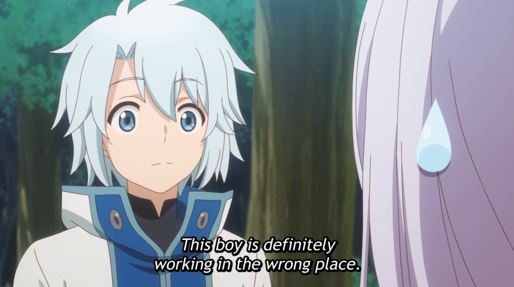 Kurt does the chores for an elite party of adventurers…until they kick him out for not contributing enough. He gets some part-time work doing construction and astounds the supervisor with how much he accomplishes (though Kurt fails to realize this). Next, he takes a mining job from a cute girl named Yulishia. He flirts with her cluelessly, as expected of an anime protagonist. He’s a whiz at mending clothes, finding gemstones, and processing ordinary crystals into magic crystals. The person to whom Yulishia sells the goods is a royal court mage who immediately demands to know who produced such amazing magic crystals. When Yulishia refuses to breach the maker’s privacy, she’s told to tell the person that the kingdom is offering them their own research lab and a noble title. Yulishia gets back to the mining camp where she’d left Kurt…to find he’s built a small house in the time she was gone.