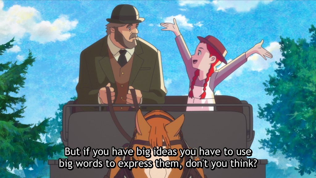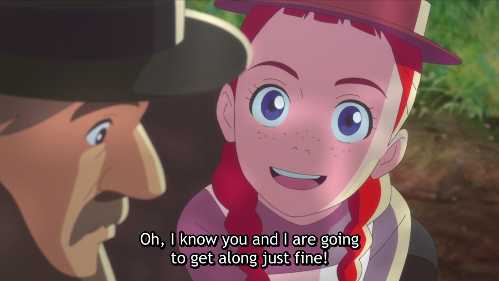 Aww! That was charming. It’s pretty much what I’d expect for an anime adaptation of Anne of Green Gables, following the original novel pretty closely (at least from what I recall from reading it some years ago). Anne’s whimsy, theatricality, and imagination really shine through here, not only in her dialogue but in her highly expressive face. Matthew is a man of few words, but you can sense his kindness. And of course there’s serious Marilla, who isn’t quite as stern and stolid as she tries to act. She gets the biggest arc of the episode, culminating in the delightful moment where she decides to adopt Anne and glares down the sketchy Mrs. Blewett. The environment is also a star here, with gorgeous scenery popping up frequently. Also, it’s just kind of cool having an anime set in Canada. I definitely recommend this one.
