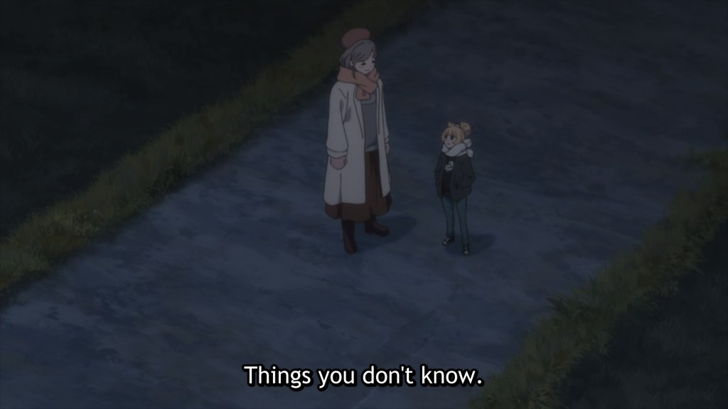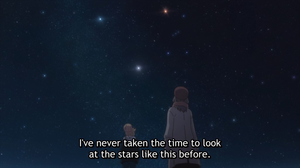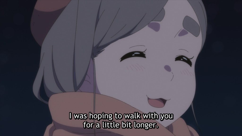 But it goes even further. One day, after Hime’s usual “torture” of relaxing at the onsen with Mama, the matronly giant invites her for a walk beneath the clear night sky, luring Hime with the promise of ice cream. This walk is crucial because, for the first time, Hime herself becomes the object of delight. Yes, Mama talks about the thrill of going for a walk at night, when everything looks so different, but this is not really what motivates her invitation. Instead, Mama simply wants to spend more time with Hime, and even suggests a detour so that they might wander together a little longer. For Mama, Hime has become the object of affection, and spending time with her, the source of pleasure.