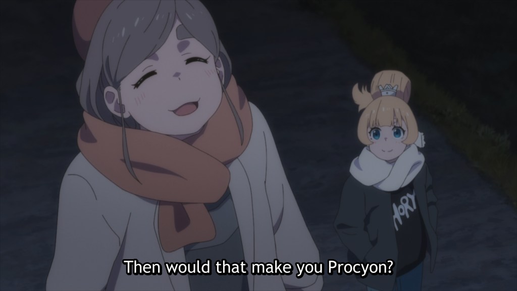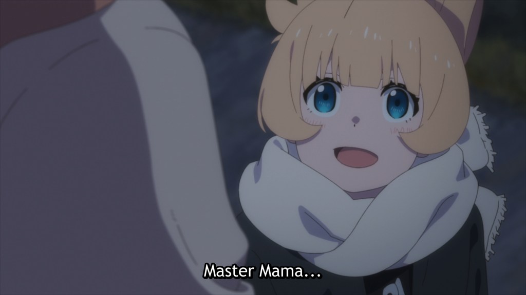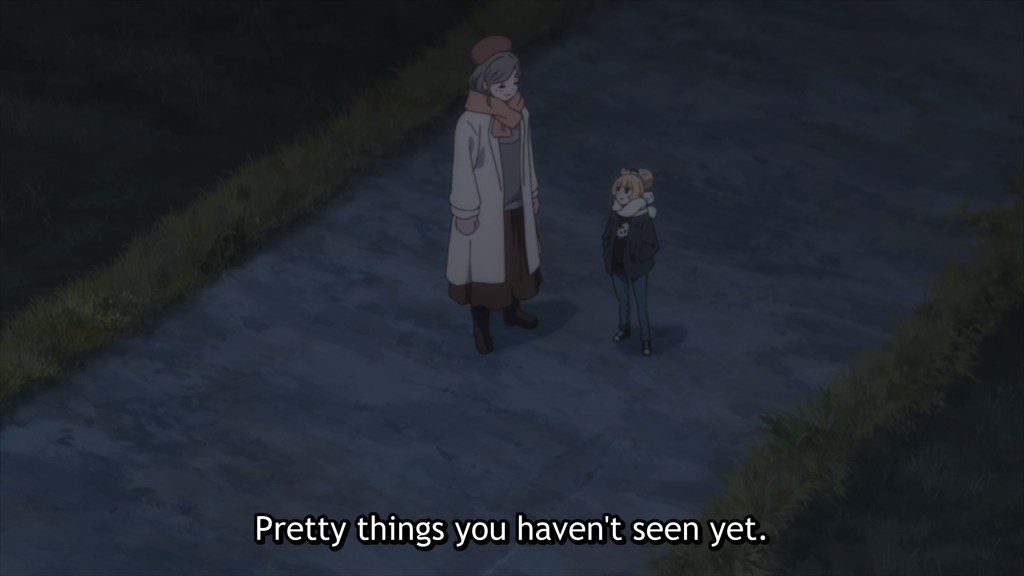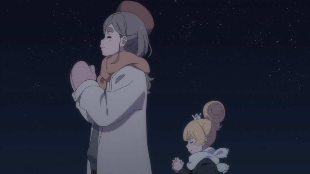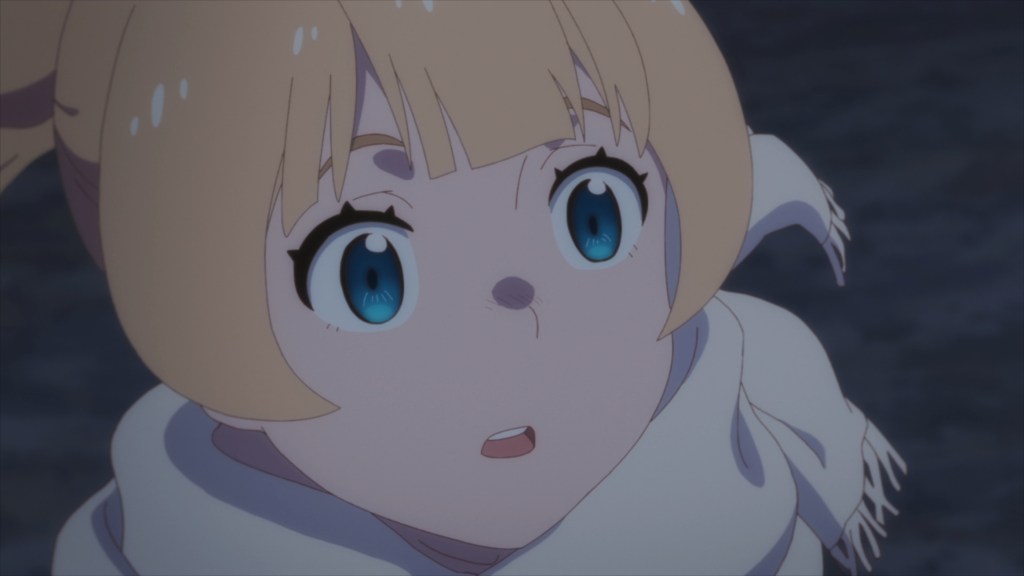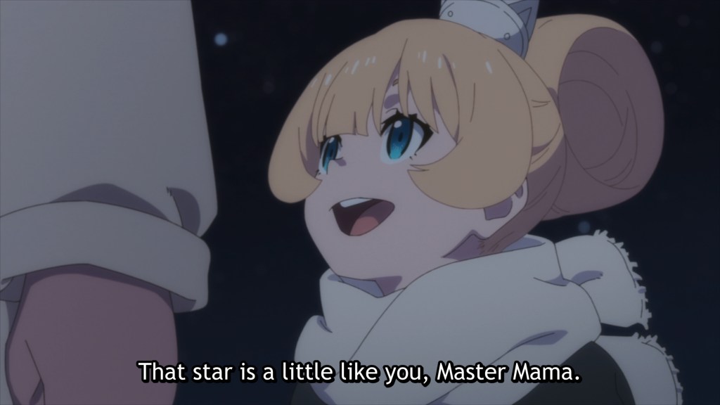 There’s still one final revelation to explore here—both in scripture and in Hime’s journey with discovering delight. You see, Hime is transformed by delight, not simply through gaining friends and found family, but because it changes how she sees the world and others in it. The change in her is made clear in the episode immediately after the starry walk with Mama, when we see that Hime has become someone who can extend this same gift of being delighted in, as Mama delights in her, to someone else. That is to say, if in episode 8 Hime is the little star, the child in the family, by episode 9, she’s become a big sister, welcoming a younger, but equally stressed-out, child into the warmth of family. This kid just so happens to be the daughter of the most malicious noble house among the Hellhorde, Vanilla Peschutz.