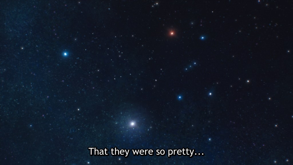 And here’s the key: Mama delights in Hime because something magical has happened—they’ve become family. As the two gaze up at the Winter Triangle, a constellation of two large stars and a small one, Mama and Hime give them new names to complement their official Latin titles: The big stars are Mama and Torture, and the little one is Hime. Under their care, Hime at last gets to be a child—something she has been denied her entire young life. And what’s more, she gets to enjoy her childhood, starting with this moment, wandering peacefully with Mama and wishing on a star. Hime’s introduction to the art of taking delight in everyday things is the key to unlocking friendship and family for her—and it is for us too.