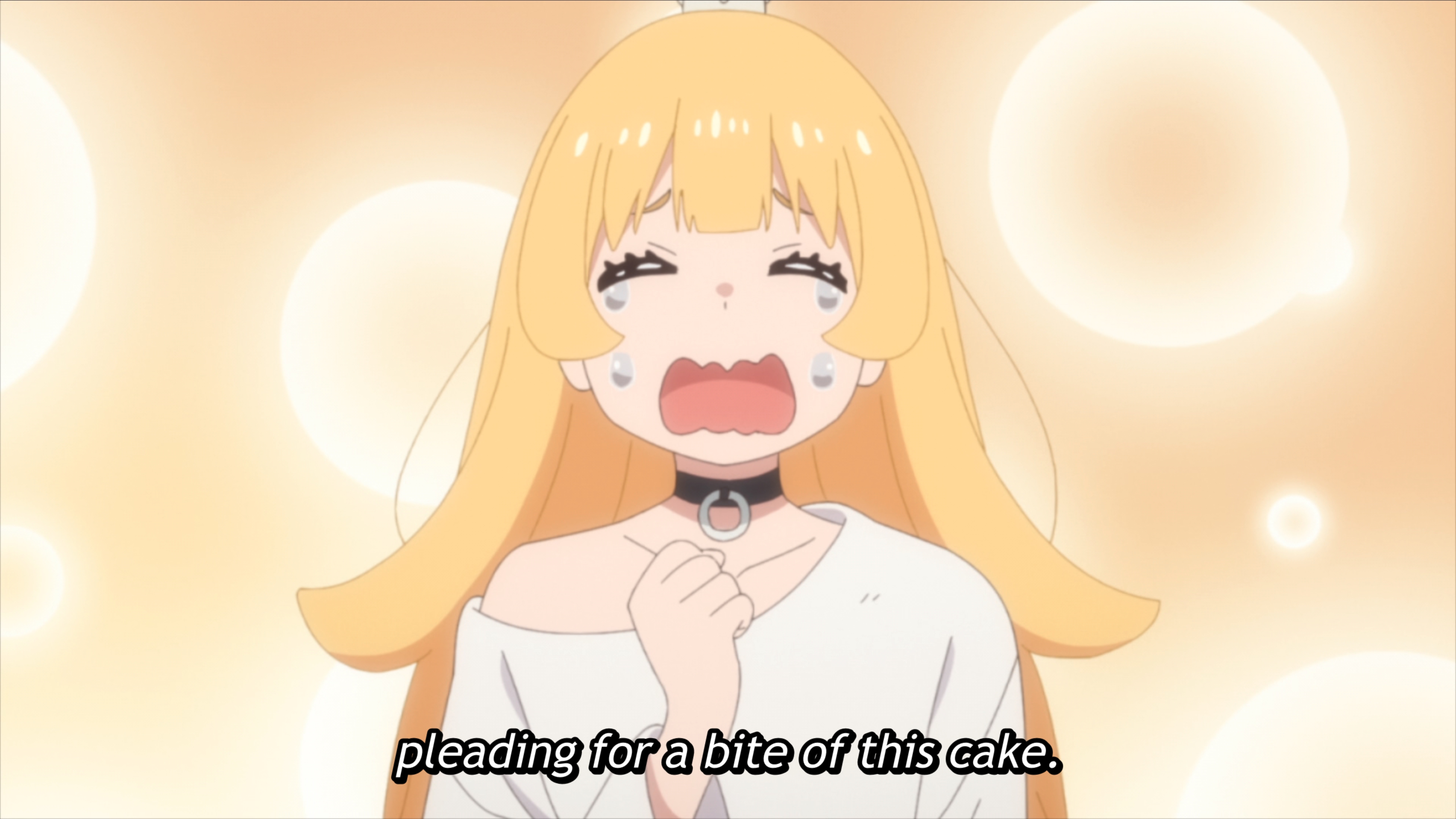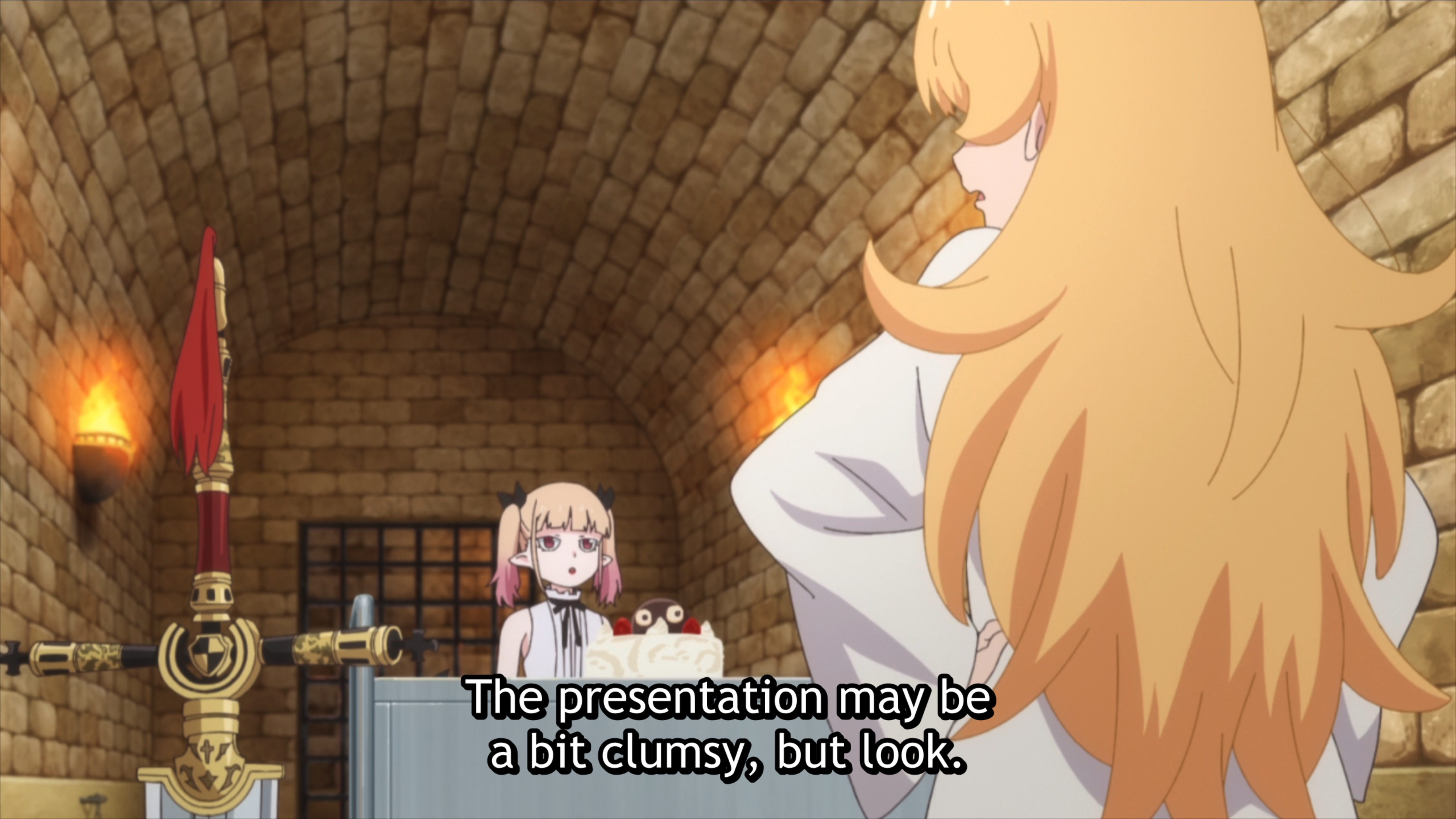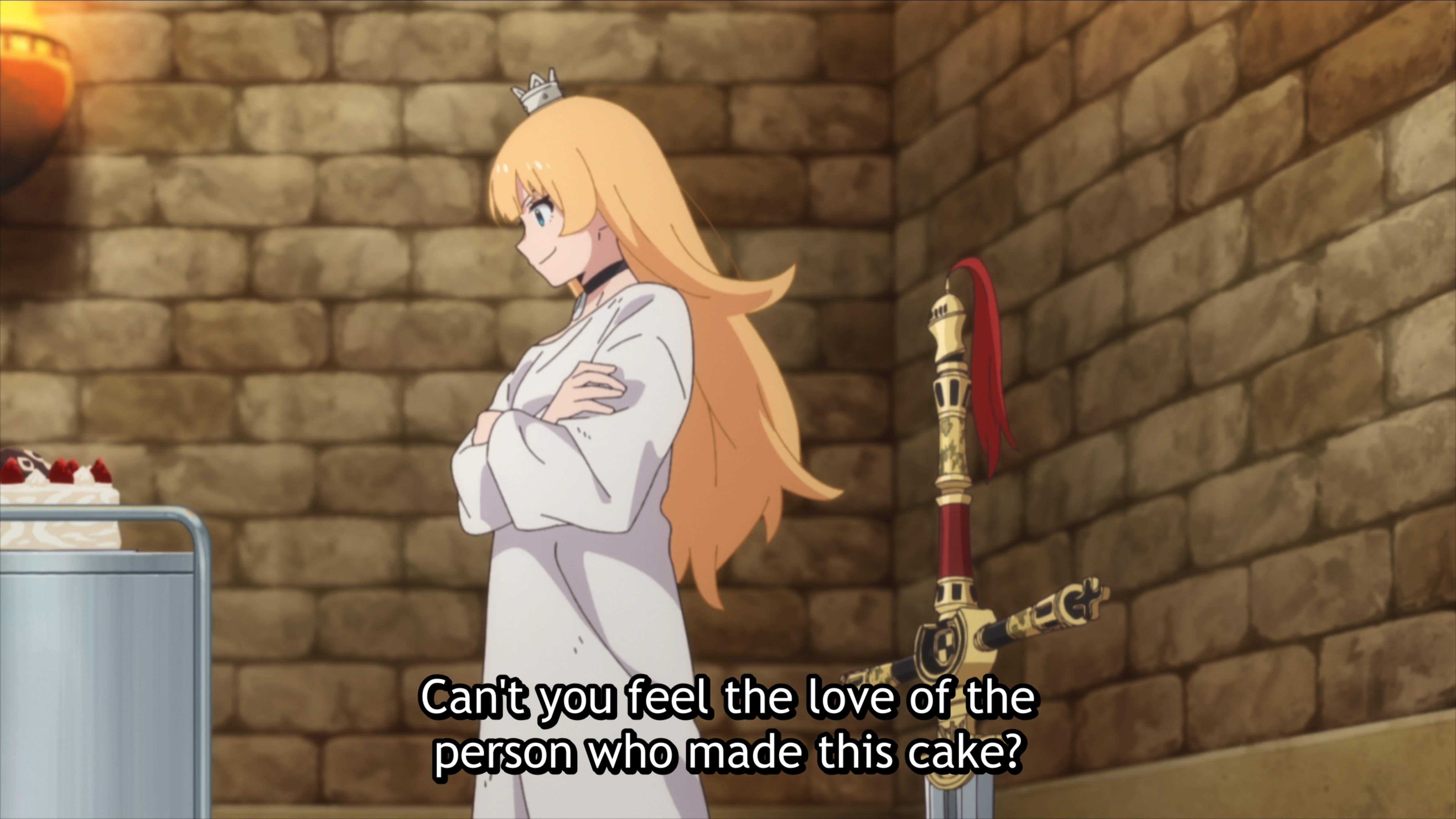 It’s young Vanilla’s first go at torture, and her strategy is to bake a cake so mouth-watering that it will make Hime cave. The problem is, Vanilla doesn’t know the first thing about baking, and the cake turns out like something you’d see on that Netflix series Nailed It, that is, a frightful mess! Hime’s talking sword gloats over the baking disaster: Finally, an easy win for Hime, right? She’s not going to spill any secrets this time…right?