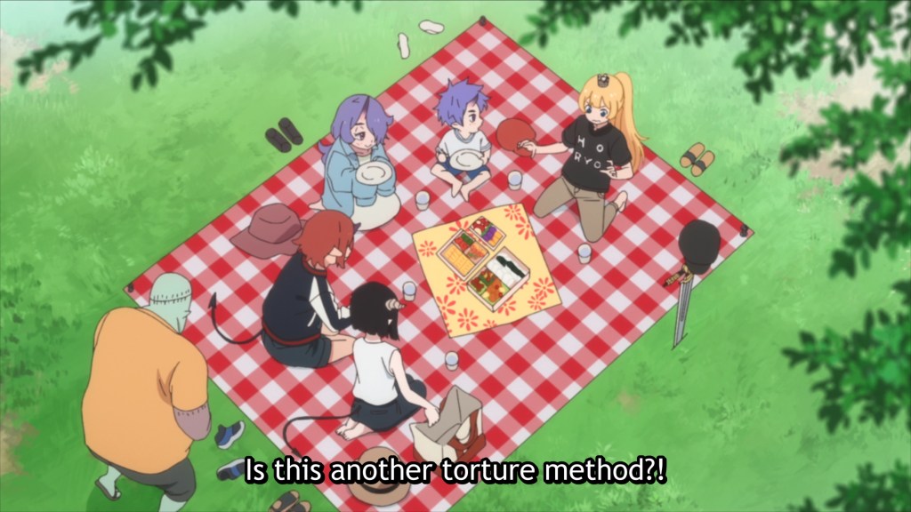 You see, Hime makes her first-ever friends through her various “tortures,” through the tiny pleasures of breaking bread together with Torture-san—literally tearing apart warm, buttered toast and slurping midnight udon and delectable xiao long bao—and playing video games with oni girls Inki and Youki. The giantess Master Mama lowers Hime’s defenses with hot spring pampering and a comforting embrace, and Krall the tiger-girl, through close encounters with cute bear cubs, paw pads, and sleeping cats. Meanwhile, the Hell-Lord’s daughter, Mao-Mao, is so intensely adorable that, well, who wouldn’t spill a few beans to play with and dote on her?! Each introduction to a new delight is also the first step into friendship for the previously solitary heroine. Pretty soon, there doesn’t need to be the divulging of state secrets any longer for Inki and Youki to play video games with Hime, while everyone enjoys the school sports day together, cheering for Mao-Mao and sharing a delicious picnic, without any thought of ”torture” because, well, it’s Saturday and who works on weekends? They are now doing life together. Forget trauma bonding. Learning to delight in things together is the true road to friendship!