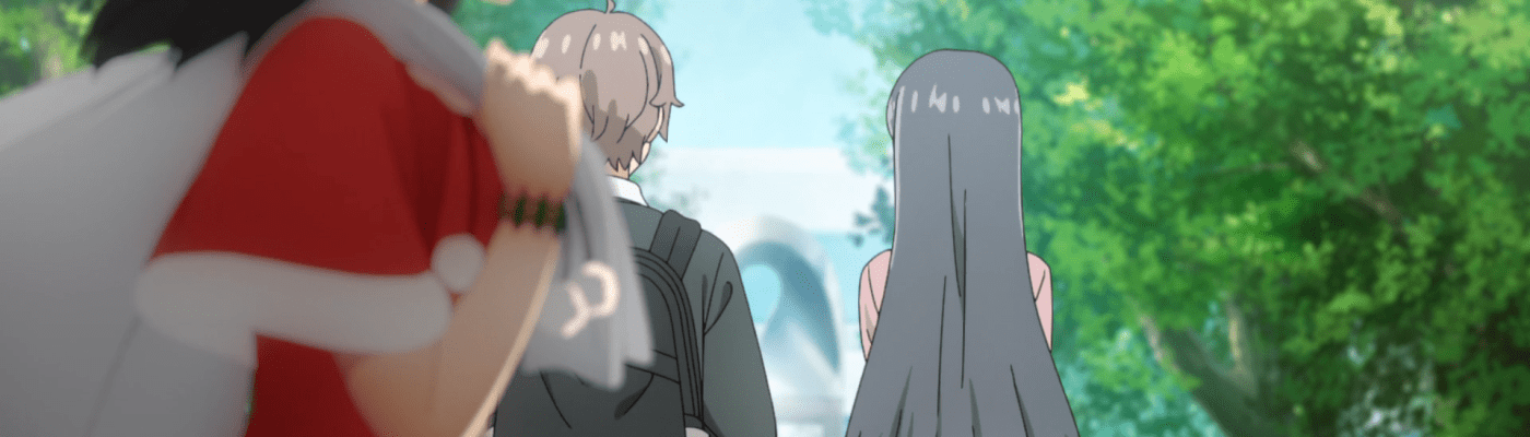 But to enjoy the series? I’m not sure it really matters if you’ve watched the previous movies. I’ve been critical of the light novels and eventually dropped them in large part because there are so very many contrivances. They drive me crazy. But they’re less obvious in anime, and because of them, strangely enough, you can kind of tune in and piece things together without worry since nothing makes total sense in the Aobuta world in the first place. And in fact, I encourage you to watch Rascal rather than read it because of how much better it flows on the screen. This season should be fun as well, though the other reason that I ended up dropping the LN series is on display in episode one: There are too many characters. Besides Uzuki and others introduced in the previous movies, like mysterious singer Touko Kirishima and Sakuta’s students, new ones are already being brought into fold, like Miori Mito and…Santa Claus? There are just too many characters now, and I don’t especially like the college ones—at least not as much as the OG gang. You might feel differently, though, and you’ll certainly want to know if Kirishima is someone we already know and who this cute Santa is.