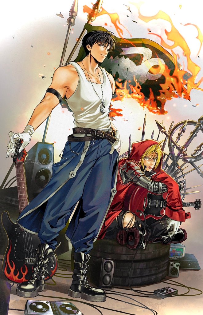 State alchemists? Rock musicians? Pirates? All of the above? Whatever it is, this is positively the most rocking, fiery fanart of Roy Mustang and Edward Elric I’ve seen! Fullmetal rockout, alchemists!