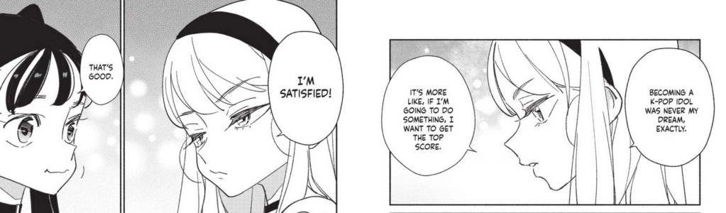 But what happens next—literally, on the following page—blew me away, and it really conveys just how genuine Tenka’s desire is to grow and mature. Rather than being hurt and offended by Harumi’s assumptions about her life’s dream, she listens to what he is saying, reflects on it, and realizes that, actually, yes, she really does want to work toward excellence in K-pop, for her own sake and not just to fulfill people’s expectations of her or to outdo Sato. She turns an instance of potential offense-taking into a moment of truth, allowing someone to speak into her life in a way that prompts a change—or rather a quickening—of heart. Beautiful!