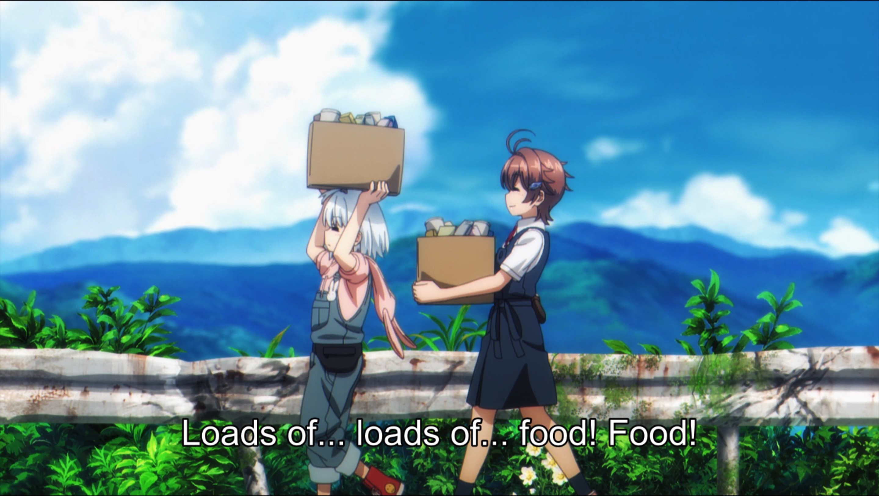 The episode throws us right into the middle of Yoko and Airi’s transformed world, and it’s up to us as viewers to play detective and piece things together. No info dump narration here! But what’s most surprising is the upbeat, celebratory tone of the episode (and indeed, the series), attesting to the persistence of life, happiness, and the capacity of humanity (?) for joy and camaraderie even in the worst of times. This makes Touring After the Apocalypse a refreshing counterpoint within the post-apocalyptic genre, which generally dwells on the selfishness and cruelty of a humanity forced into survival mode. Yoko is the kind of girl who, upon discovering a stash of food, leaves some behind for the next person and even carves a sign pointing it out. All in all, this episode is a thoughtfully and beautifully executed adaptation of a delightful series!