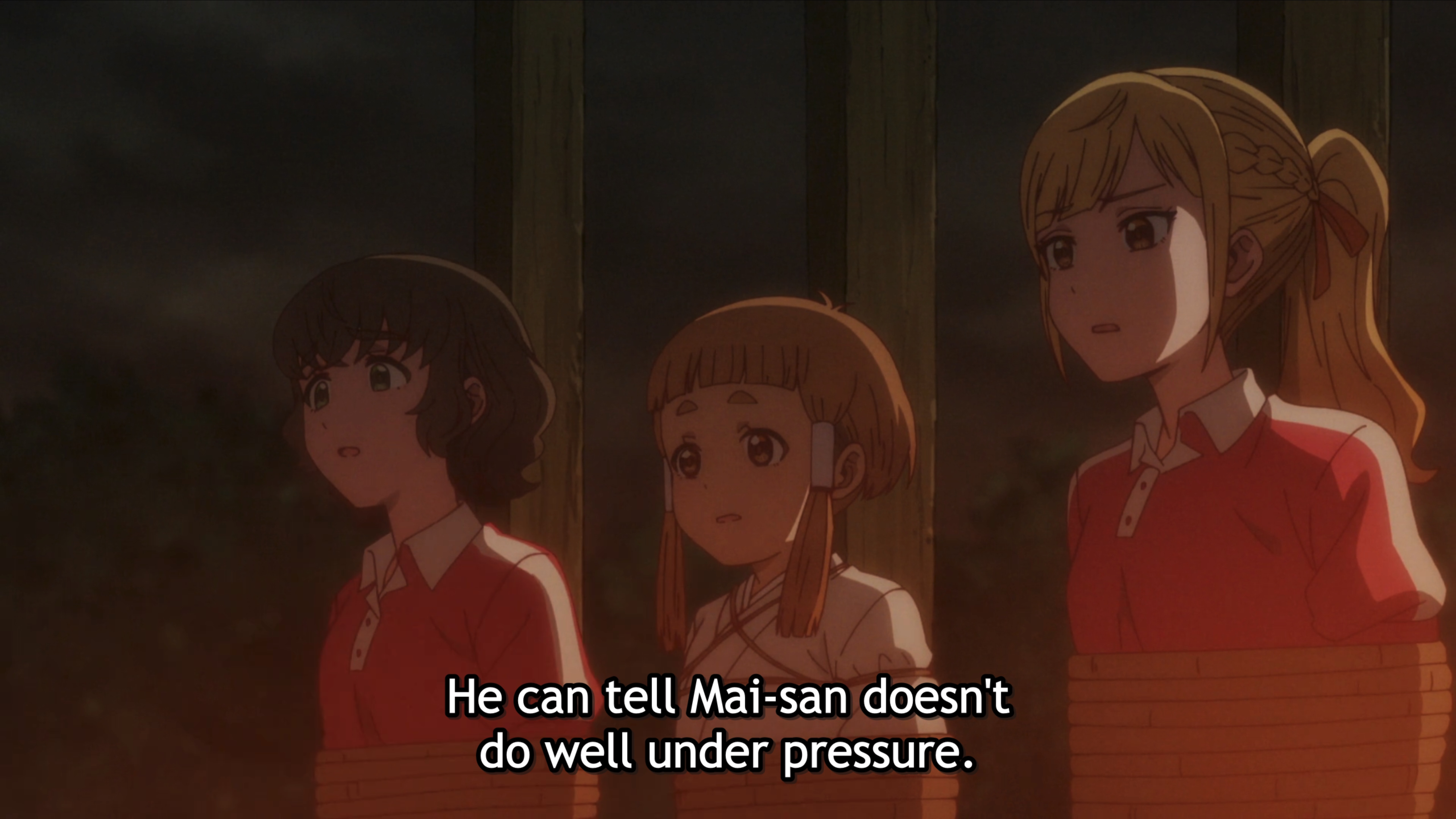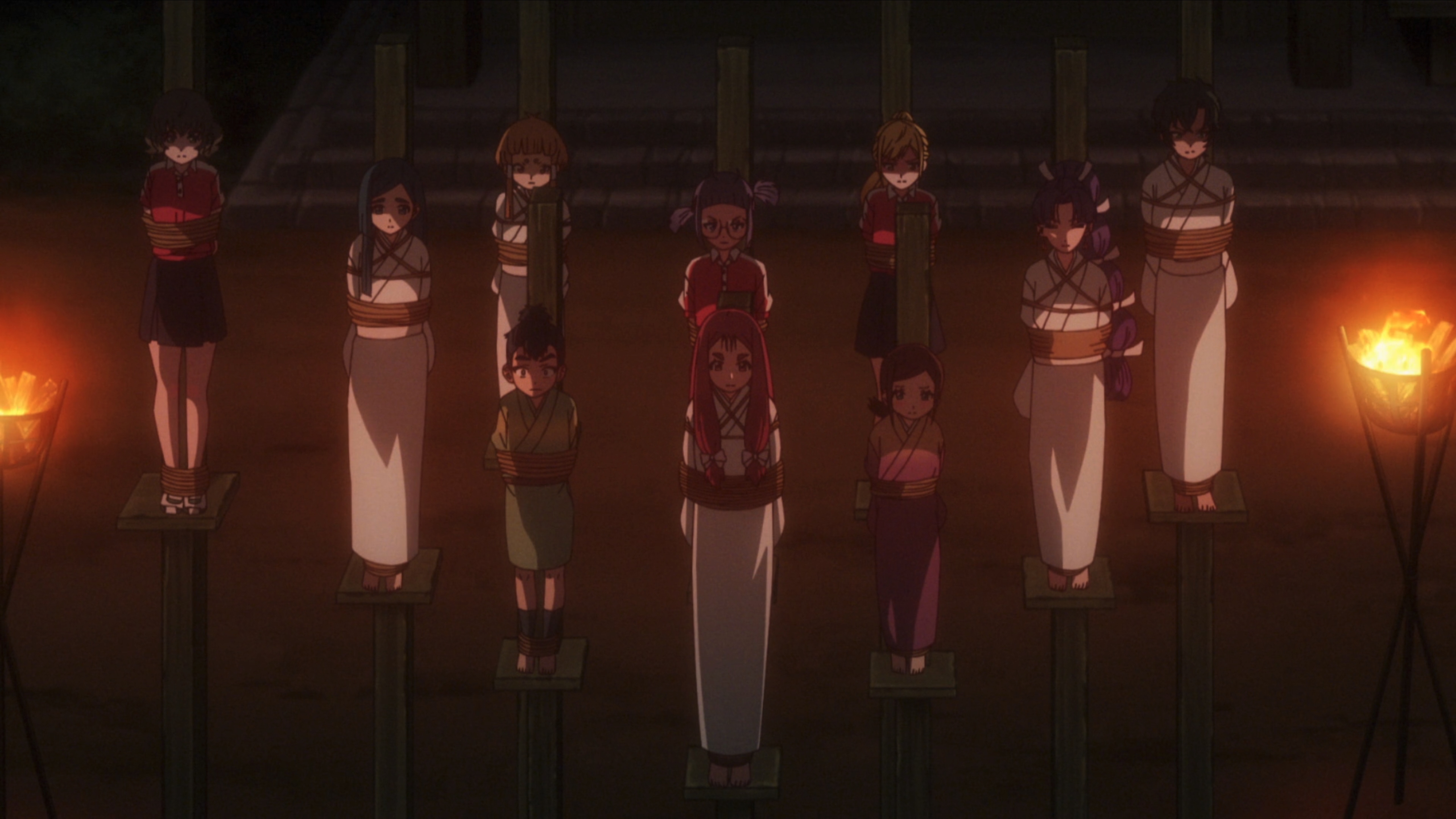 You see, in the name of kami-sama, the shaman changed the rules of the wager they had agreed upon. On the surface, it actually seemed to be an advantageous change for Mai and her teammates: Instead of five of their friends being executed if they failed to bowl a single strike out of five, the shaman lined up ten friends and teammates like bowling pins, staking them to posts overlooking the alley, and said that, should any pins be left standing, only the lives of the corresponding friends would be forfeit. Seems generous—merciful even, right? Wrong. Mai is an excellent bowler, but she has been struggling with the yips all series, and seeing her friends tied up at the end of the bowling alley was guaranteed to mess with her head. It was a masterful move of psychological warfare by the shaman, such that it would be virtually undetectable to an outside observer.