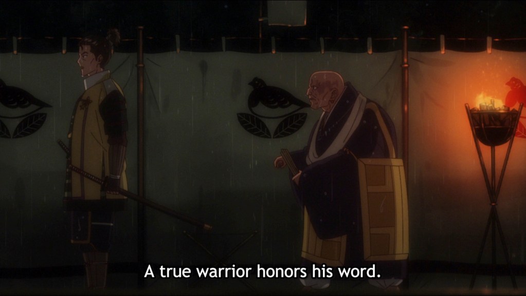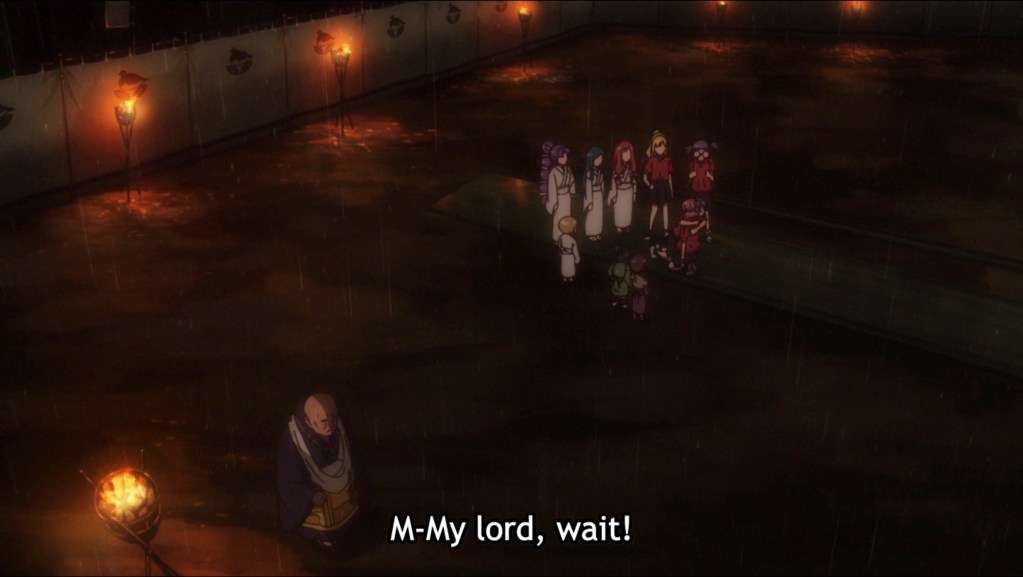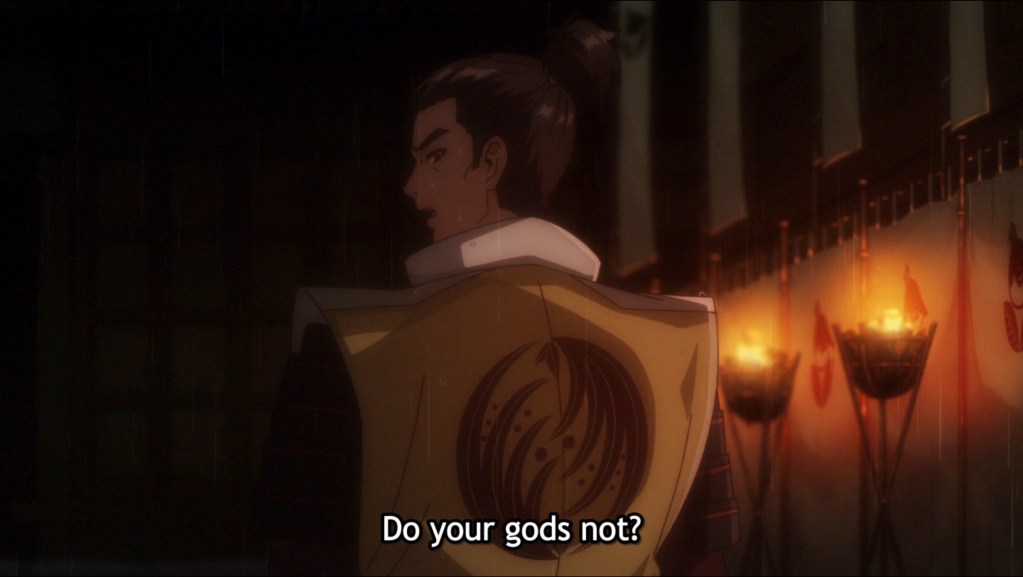 It doesn’t stop there, though. After acknowledging Mai’s victory, lord Kagetoki, whose every decision, every action, and seemingly even every thought has demurred to the shaman and his proclamations of the will of kami-sama, likewise rejects the gods. For Kagetoki, the turning point comes when the shaman attempts, once again, to change the rules following Mai’s miraculous bowl. Kagetoki views this as a breach of honor, a failure to keep one’s word. He turns his back on the voice of authority that has shaped his entire adult life, and walks away.