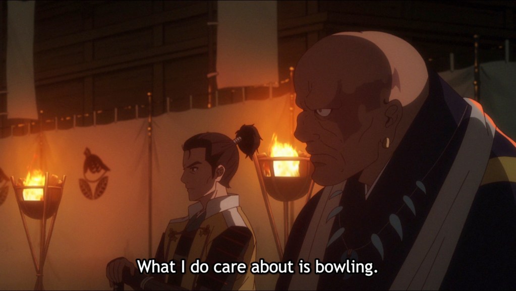 Ok, now that you know that Turkey! is not really a slice-of-life series about bowling, but rather, a tale that uses time travel in order to dive deeply into the churning waters of conflicting cultural mores and values across Japanese history, let’s get started! We join the high school girls’ bowling team in a moment of utter crisis. In a bid to save their Sengoku-era friends from death at the hands of the cruel lord Kagetoki and his shaman, the girls had engaged their foes in a wager, seeking to defeat them in a contest of bowling. But things do not go well, and team captain Mai is faced with the unthinkable: two of her friends will now be executed. As a heaviness as dark as the night sky threatens to consume her, Mai cries out and confronts Kagetoki and his shaman. But rather than decrying their cruelty or pleading for mercy, Mai does something so unexpected and so forceful that it made me catch my breath: She rejects kami-sama (“god” or “the gods”) and professes her faith in bowling.
