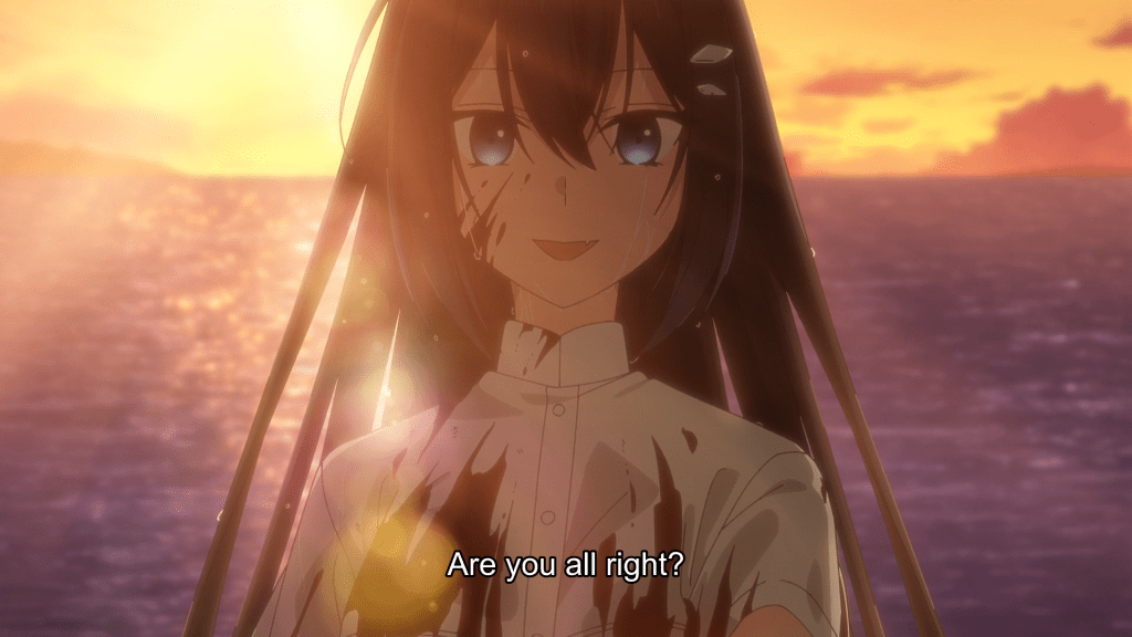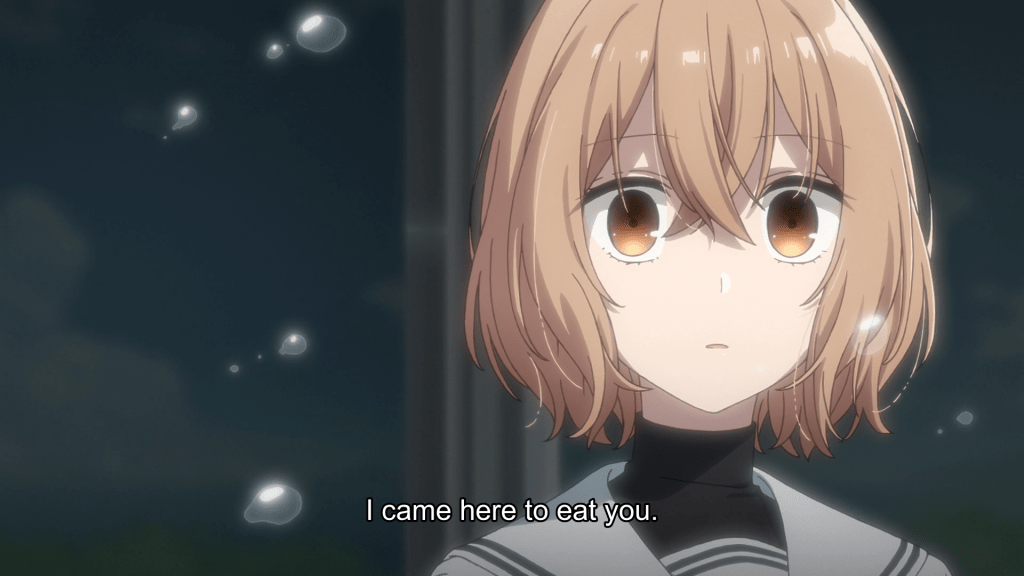Then there’s the central relationship—spoilers ahead for episode one. While the director wants to keep you guessing, it’s really easy to figure out what’s ahead in this episode, including that the girl that Hinako meets (Shiori) is going to be her love interest and is “of the sea.” What I didn’t know was that she was going to be a mermaid—a flesh-eating one, which fits with the recent depiction of mermaids in manga and other media, and with this whole approach to yuri series where a dangerous element is added situationally or by the character’s identity (vampire is another common one), adding a new slant to the romance. Much as with vampire yuri, one character will feed on another, which is an interesting element with the potential to be problematic, including here, where the series wants to understand just how depressed and suicidal Hinako is. And ultimately, more than the pacing issues, that’s what turned me off about episode one, which tries to express how much Hinako is in need of a savior, but both does a poor job of expressing her depression (her slight voice and endless monologues feel more like a caricature of depression rather than a true expression of it) and creates the possibility of an ugly, possibly abusive relationship that will be depicted as romantic. Who knows—This Monster Wants to Eat Me may not end up as another toxic yuri series, but that’s not the impression I got from episode one. You may want to continue to tune in and see where it goes, though unless your jam is “heavily atmospheric, slow-moving yuri series”—and it might well be—I’m not sure why you would.