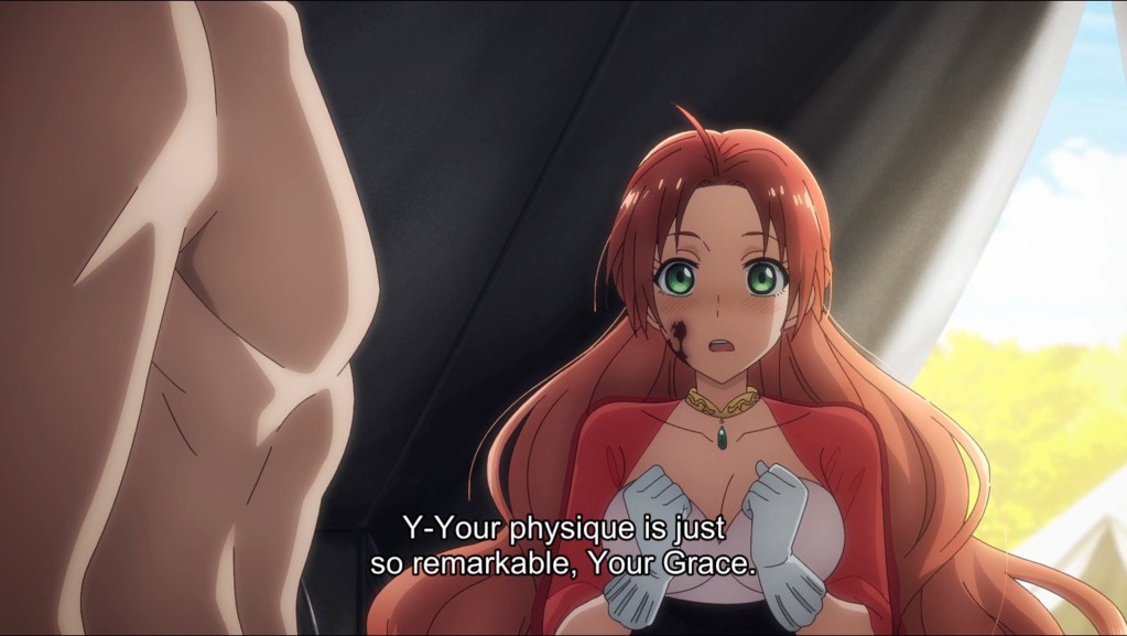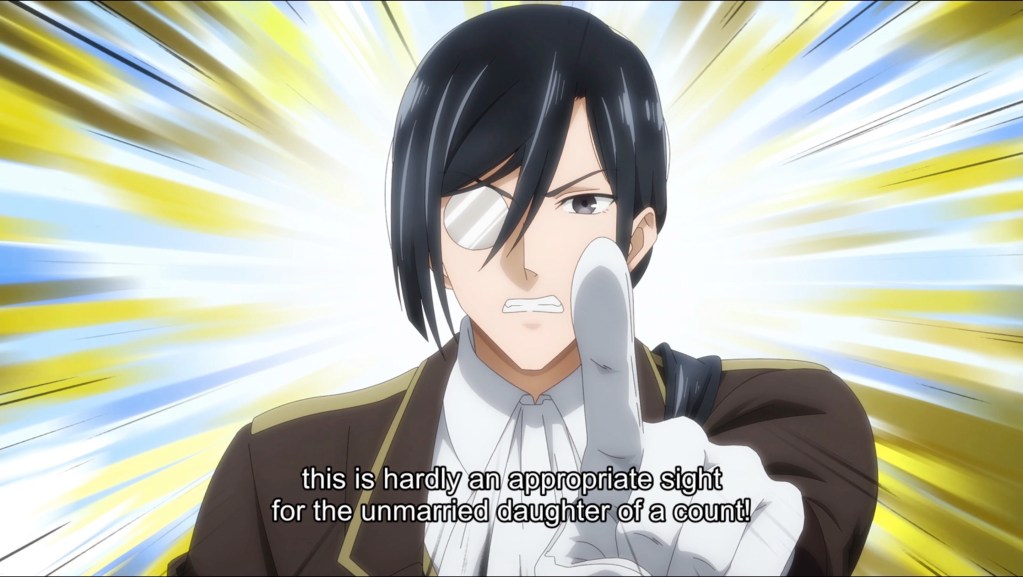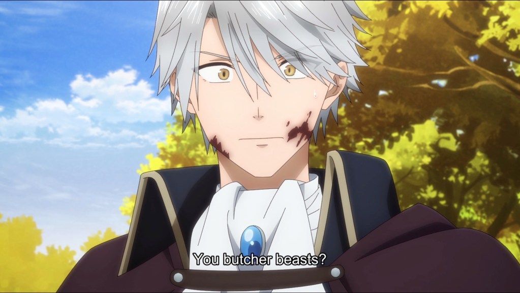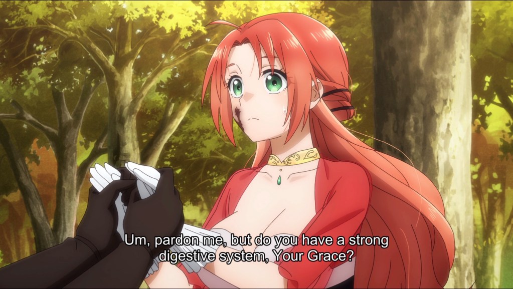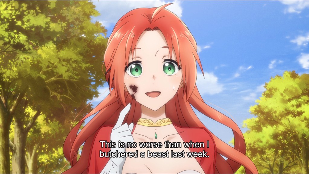 Well, I think we’ve just uncovered where all those monster meat recipes came from in Dungeon Meshi! Melphy may be pioneering in her tastes, yet even so, this premiere is a little on the bland side. Don’t get me wrong, the two leads are sweet—the term “adorkable” comes to mind—and I’m happy they found each other, but this does feel a bit more like a tossed salad than a hearty meal of a premiere. The animation is nice enough, but not terribly imaginative, which seems like a missed opportunity with such a fantastical premise. The humor is surprisingly tame and innocent, which is absolutely fine, but given the slightly spicy bent of the characters’ nicknames, and the rapidity with which the duke sheds his shirt, I was nervously expecting something “nearer the knuckle” to break out at any moment, though it seems my wariness was misplaced. The episode does have one thing going for it, though, and that is a consistency of tone and genre that, to my mind, has been lacking in some of the more recent ventures to weave food appreciation segments into their storytelling, like the aforementioned Dungeon Meshi or Momentary Lily (sorry folks, I could not get along with the tonal whiplash of these series, intercutting slice-of-life cooking demonstrations with a perilous race to save a friend’s life—everyone knows that when on a rescue mission, one does not stop to eat, sleep or pee, I’m sorry). Mind you, we don’t get much instruction on preparing backhorn meat, so I wouldn’t expect full-on meal prep guidance here, though there are some handy tips on tenderising meat. The focus is very much on meat, by the way, so vegans beware! And for everyone else, well, this series is a little like the little bowl of water with a slice of lemon that you get at fancy restaurants: Use it or ignore it how you will. It’s not gonna be the thing you remember at the end of the meal—or this season of anime.