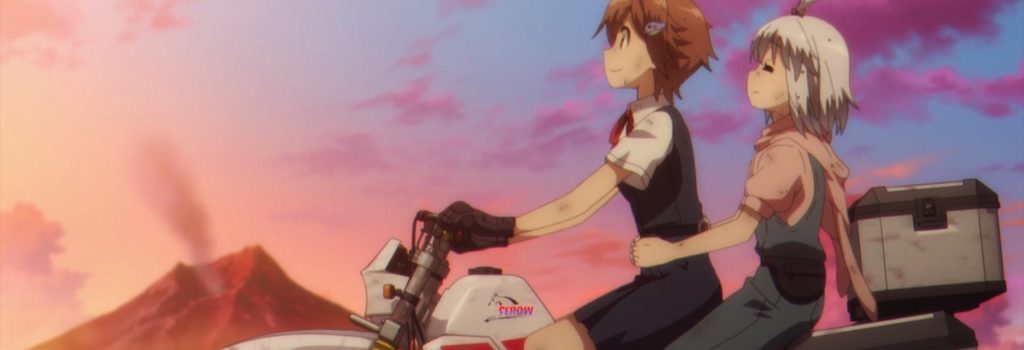 Sometime in the future, when gas engines are a rare sight, two young women tour across Japan on their Serow motorbikes, hitting all the popular tourist sites and local attractions. What a stunning country it is! As the camera lingers on the landscape, the swelling soundtrack shifts into something more intimate, and the sound of the bikes’ engines changes too, losing the rumble of the carburettor and the retort of the exhaust. The roads are suddenly overgrown, the asphalt cracked and pitted with craters. There’s only one bike now, muddy and running on electricity, and perched atop it are two young girls, Yoko and Airi, recently escaped from the shelter—the shelter where they presumably rode out the apocalypse. The world around them is empty of people, but it is still beautiful, even more so, perhaps. The empire of flora and fauna is a fecund, fruitful one, even amid the radiation that apparently persists, according to the self-driving manoeuvre combat vehicle that gives a weather report over its loudspeaker before turning and firing on the girls. Wait, what?!? Yoko and Airi hop on their Serow in hopes of outrunning the mad vehicle, but will the electric bike have enough oomph to ensure that Hakone isn’t the first and last tourist destination they check off their list?! And what’s with Airi’s arm…is that…a death ray?!?!?!