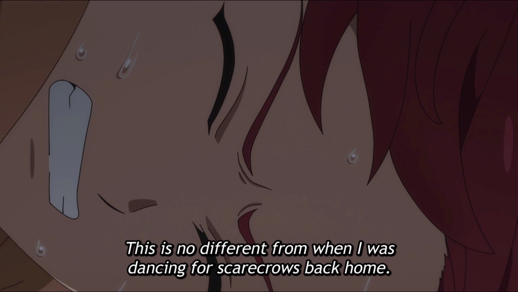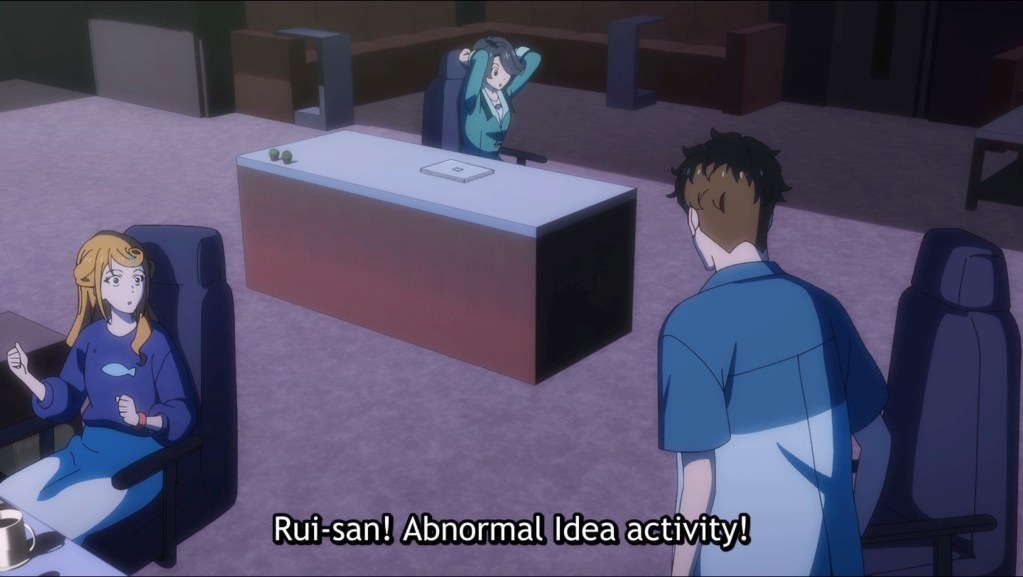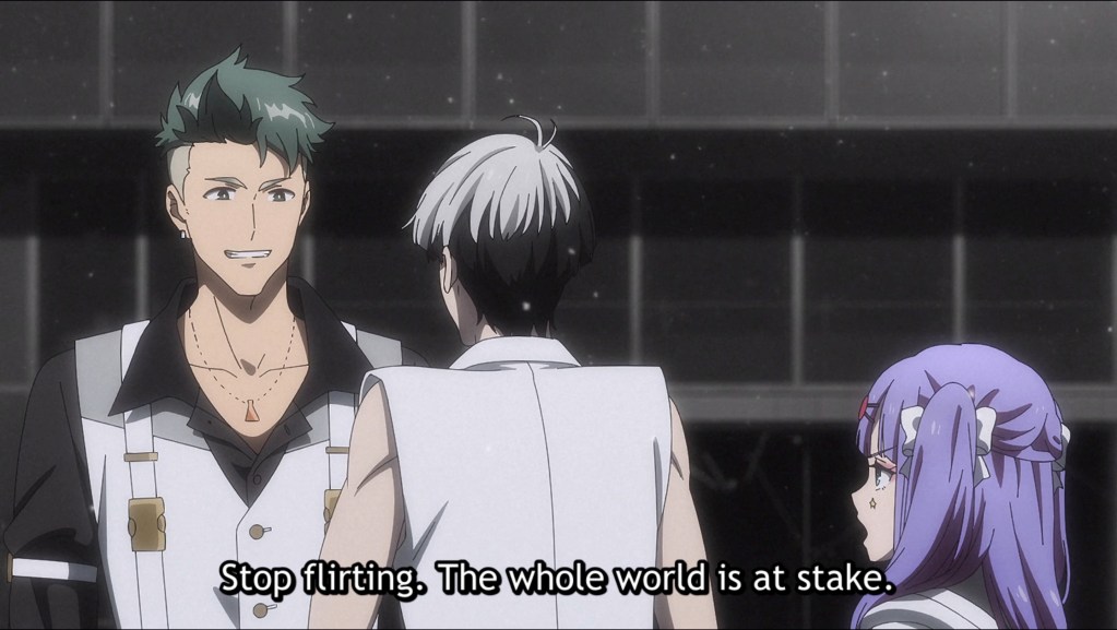 I don’t really know what to say; just watching and synopsizing this one kinda took it out of me. I was actually mildly interested, initially; my curiosity piqued by the fact that SI-VIS is a co-ed group—such a rare sight in music/idol anime! And even quite rare irl these days, too. I was willing to give it the benefit of the doubt when it became clear, within the first few seconds, that this was likely to be more focused on some kind of technological-supernatural battle rather than the music itself, making this a kind of sci-fi musical. *Shivers* Things took a steep nosedive, though, with the introduction of the eminently annoying Kyoya, and the downturn only steepened the moment he started to dance. (Yikes, talk about second-hand embarrassment.) I’m not a fan of leads who force everyone around them to make up for their reckless incompetence simply because they “believe in themselves” or “have a dream,” and Kyoya is the very embodiment of this trope. I won’t spoil it, but let’s just say that it’s clear the entire series is going to center on Kyoya in all his unglory. On the plus side, the animation is decent, with fairly well-integrated 3D assets and acceptable action sequences, with some cool moments of forced perspective. There’s very little musical performance, though, and the music itself, which is only doled out in parsimonious snatches here and there, is infinitely forgettable. I don’t understand how a vocal group of five members would be given a soundtrack of solo-artist compositions. What are the other four doing? Fighting monsters, I guess. Yeah, this one’s not for me.