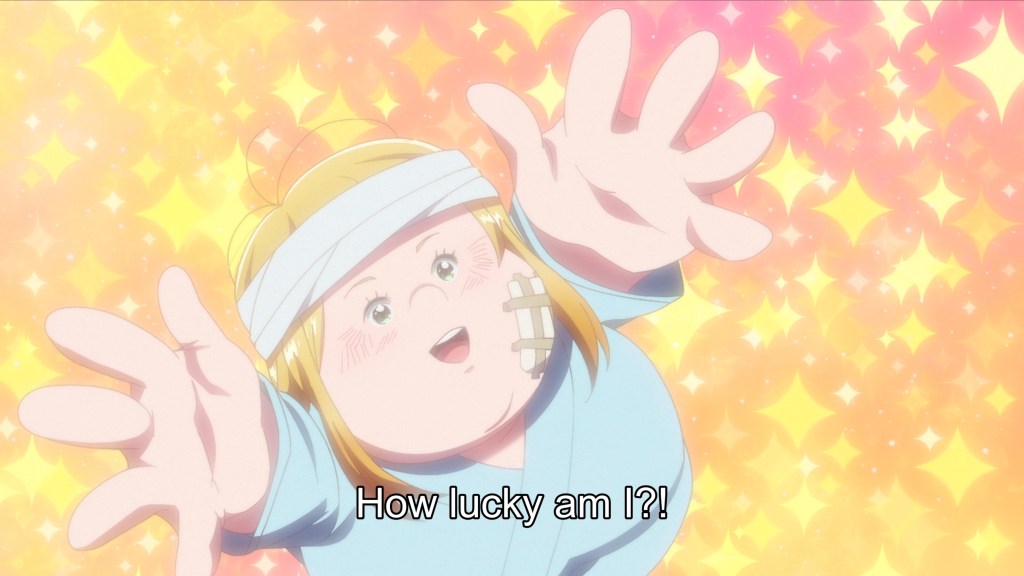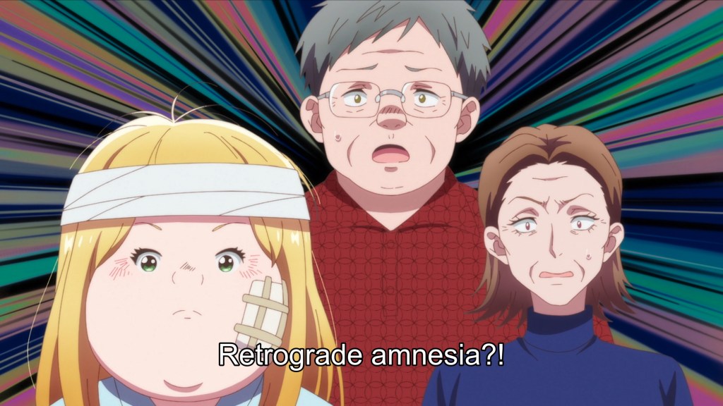 This was three parts cute and sweet, and one part sheer harrowing intrigue! The pacing and writing are perfect for selling this as a workplace romcom that is secretly a thriller, with little hints being dropped in “blink and you’ll miss it” fashion throughout, steadily ramping up the tension until the reveal. (There’s more to the episode as well, not spoiled above, adding more layers to the core mystery.) I have so many questions—about Yumeko’s backstory and who she used to be, which Yumeko herself is trying to uncover; about her relationship with her parents, which seems to be somewhat strained; about the handsome man at the heart of it all; and, of course, about her potentially murderous office mates. And I can feel that this one is going to keep me guessing all season! I also just really like Yumeko: she’s so full of joy, it’s positively contagious! Watching the effect that her confidence and joie de vivre have on those around her is delightful. The animation and color design capture her sunny exuberance really well, with some thoughtful layouts and plenteous peeks into her “inner world” making this a fun watch. All in all, MarvyJack studio has done a fab job with its premiere title as lead studio! I’ll admit, I wasn’t expecting much, but I’m sold on Yumeko and her story. Can’t wait for Mondays now—words I’ve never said before!