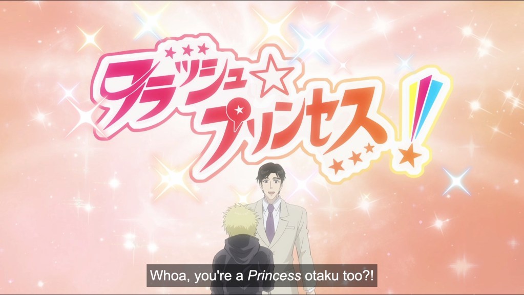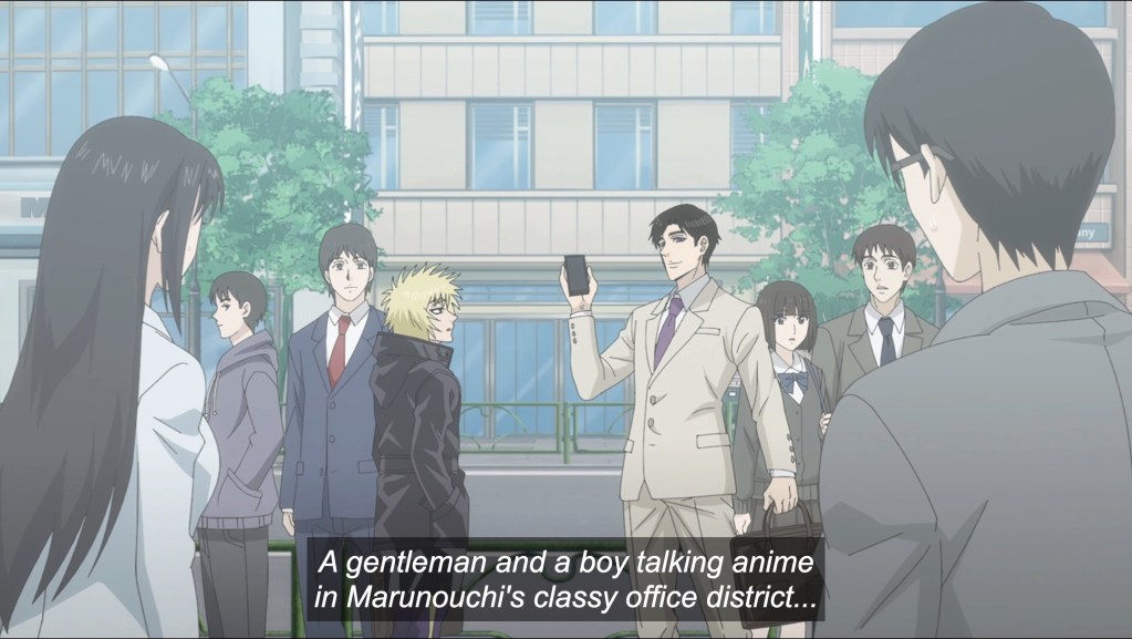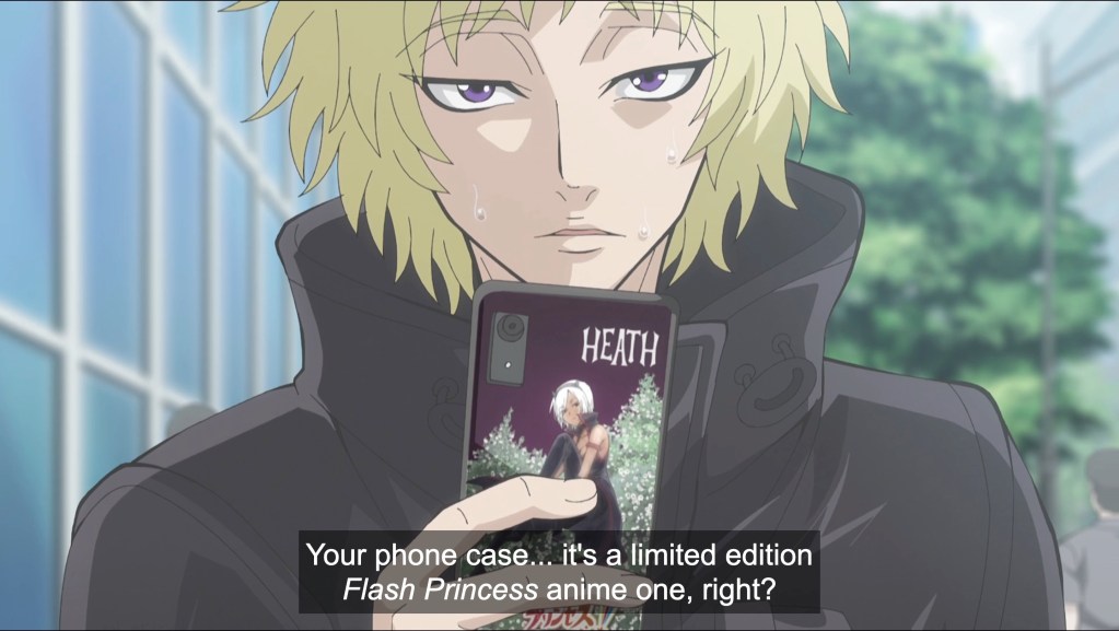 Ninja and gokudo (yakuza) have been warring over Japan’s underworld since the Great Fire of 1657 wiped out two-thirds of Edo. Three centuries later, two strangers are brought together on the streets of Tokyo’s central business district over a shared passion for the anime Flash Princess, when one saves the other’s phone—clad in a limited edition character cover—from a fatal encounter with the sidewalk. Kiwami Kimura, whose first name uses the kanji for gokudo, is a tall, suave businessman and the owner of the phone. Its rescuer is Shinoha (using the kanji for ninja) Tanaka, a blond, shock-headed, Pinocchio-nosed short king often mistaken for a boy, though he’s old enough to have committed 17 seasons worth of Princess to memory. And to have superseded his ninja Master in developing the speed of his hand strikes, which routinely break the sound barrier. They are so fast that the heads of gokudo continue monologuing even after having been separated from their bodies by Shinoha’s hits. But I digress; back to the budding friendship born of shared Princess otakudom. The two meet again at a limited-time merchandise sale and continue to hit it off, going for a meal after snagging their merch. Shinoha even tries to smile, using his hands to lift the corners of his mouth in a frightening grimace. Poor boy, er, man can’t smile or laugh due to childhood trauma. Also, he’s never needed to before, having been focused solely on training to eradicate the gokudo from Japan. But now, perhaps he has his first friend? Cut to Kiwami changing his shirt: Are those yakuza tats painting every inch of his torso?! Who will win? Ninja, gokudo, or the power of friendship and Princess anime fandom?