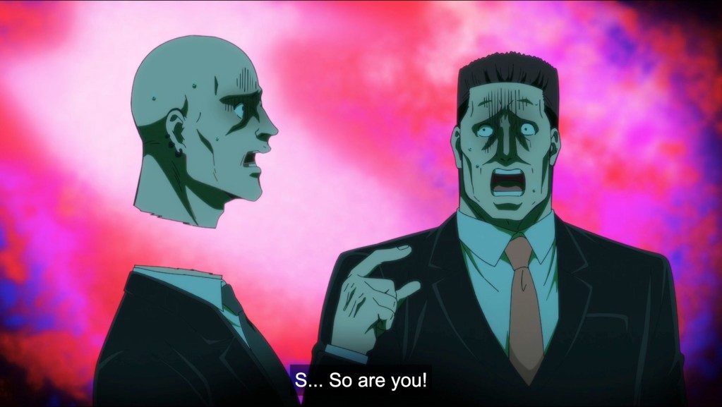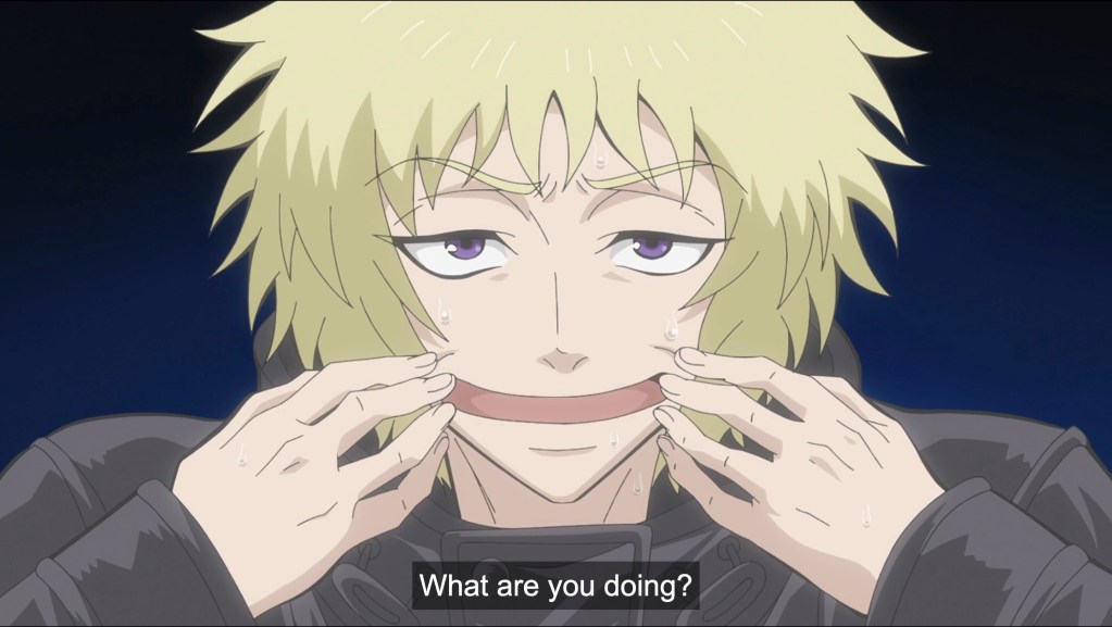 This was wild! Not at all what I was expecting, on any level. First off, the art style is quite unusual, with long pointy noses a la Tokyo Revengers but more so, thick contour lines like a classic comic book, and a desaturated color design, such that it almost feels at times like there’s a layer of fine cloud over the frame. Can’t say I’m a fan of it, to be honest, but at least it is distinctive. Second, although there are a few action sequences—well, as much as one can call decapitated talking heads flying through the air, action—the emphasis is more on the slice-of-life side of the story: The meet cute and growing friendship; Shinoha’s relationship with his ninja Master, who works as a waiter who carries out his duties with bullet-like precision and speed; and the backstory behind the younger ninja’s inability to smile. The “forced smile” gag gets a little old, being the mainstay of the humor here, but there are a few other gimmicks too, such as the fowl- foul-mouthed crow who delivers Shinoha’s orders, and Kiwami’s universal affability. I’ll admit, I’m on the fence with this one, as just as many pull factors as push factors are at play here, warring over whether or not I’ll be adding this to the watch list. I’ll give it another episode or two with lunch and see how it goes!