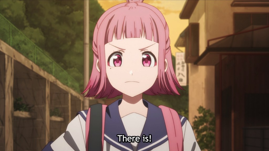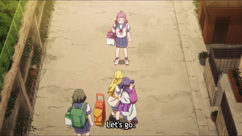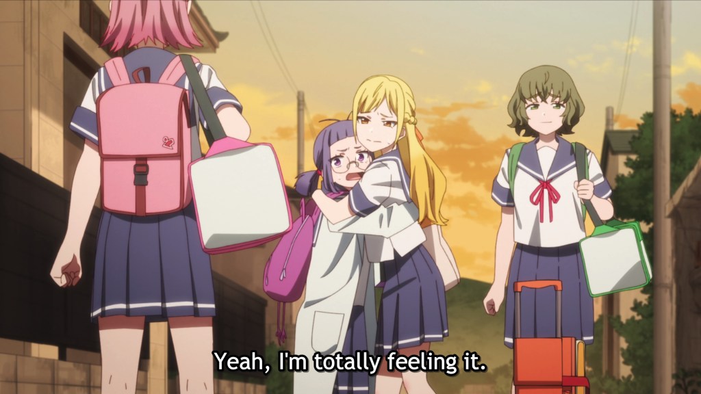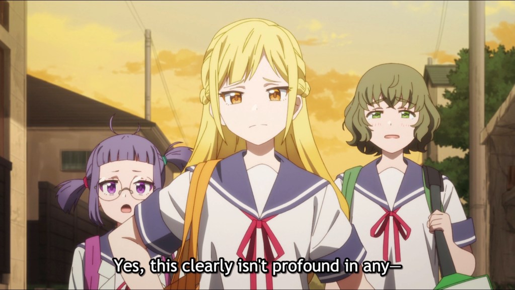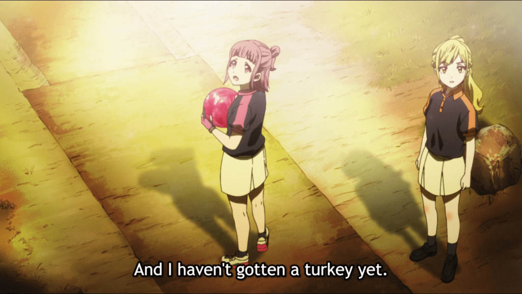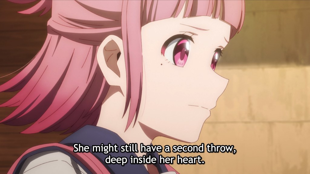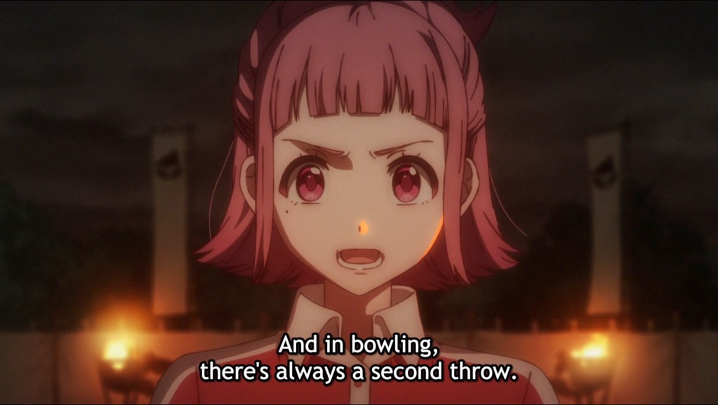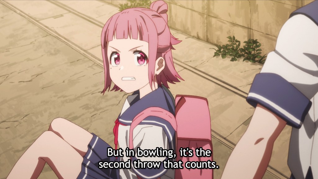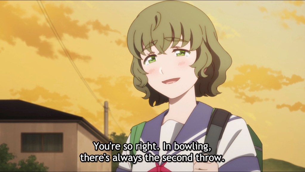 As the four remaining friends wend their dispirited way home, variously harrumphing or mournful (depending on their commitment level to bowling), Mai stops in her tracks. She’s made a mistake. She should not have let Rina go, not without trying to mend their bridges first. It’s in this moment, facing her confused clubmates, that Mai first calls upon the second throw as a metaphor to express why she must turn around and reach out to Rina right away, before it’s too late: