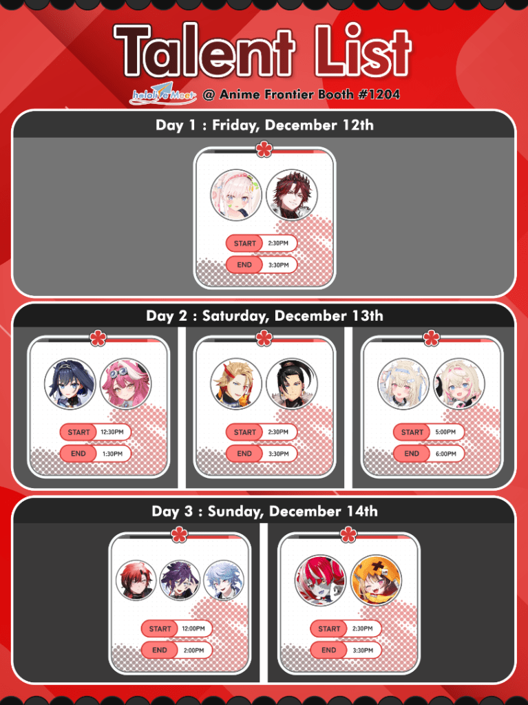 • COVER Corporation is bringing their hololive production booth to the con! There will be exclusive live streams taking place for fans, and the talents are to die for: Airani Iofifteen and Kureiji Ollie from hololive Indonesia; Ouro Kronii, FUWAMOCO, Gigi Murin, and Raora Panthera from hololive English; and Axel Syrios, Machina X Flayon, Banzoin Hakka, Josuiji Shinri, Jurard T Rexford, and Octavio from HOLOSTARS English. They’ll be live and interacting in person on the show floor!