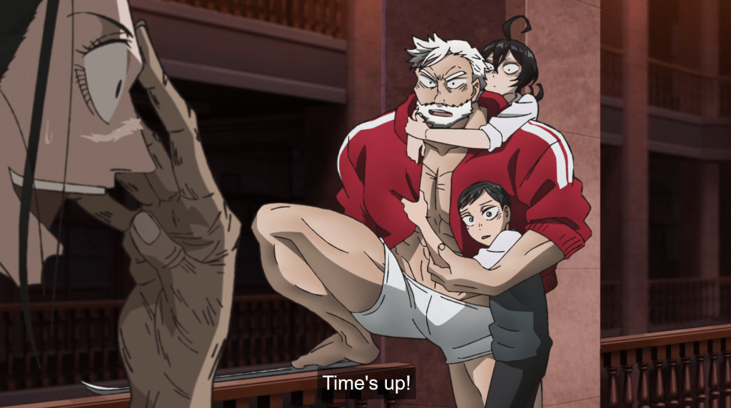 To be sure, it feels like a strange comparison to make at first. After all, SANDA begins with an attempted child murder, as middle schooler Shiori Fuyumura stabs her classmate, Kasushige Sanda, in the chest in order to summon Santa Claus. And because this is anime, it works! Sanda, who already knows that he’s in Santa’s family line, transforms into a full-grown, ultra-buff, old-man Santa, and along the way discovers super cool powers as he attempts to help Fuyumura find her missing friend, Ichie Ono.