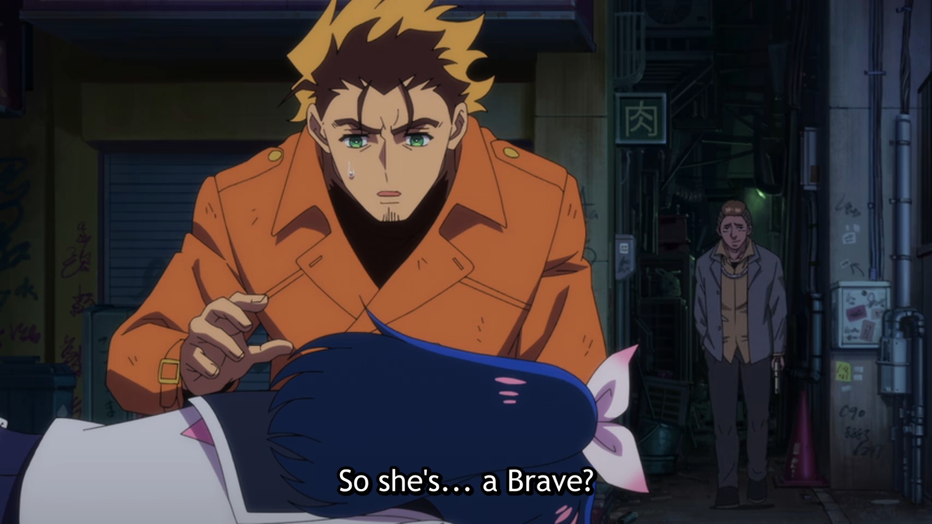 This was an extremely enjoyable first episode! The idea of Dark Lords and superpowered individuals battling it out in the Tokyo underworld is an evocative one, and the noir touches are much appreciated. I loved the “Wanted” signs, the seedy bars, what we see of the power system, and the implications that swords and guns are used in equal measure. The Dark Lord looks threatening and impressive. But what really got me invested in the story was the contrast between the personalities of Jougamine and Yashiro, and their different outlooks on what it means to be a Brave. The idealist vs. the world-weary, the rule-follower vs. the instinctive player, the one who keeps the heroic ideal intact vs. the one whose morality has grayed with the years, the teenager vs. the twenty-something: I think that there’s potential here for a cool, mutually enriching, buddy cop-style story, and I’m here for it.