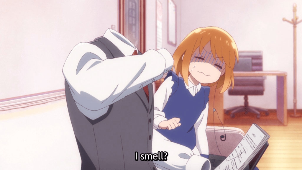 We have another cute office romance this season, and this one has a few interesting twists to it. The first obvious aspect to note is the supernatural element, with all the aliens and animal-people making an invisible man feel much less out of place. No explanation is given for how this otherwise modern-Earth world ended up like this; it’s just used for a couple of gags and for adding a bit of extra intrigue to the setting. The second notable aspect is that the female protagonist, whose perspective the episode largely follows, is blind. A lot of animation and story details go into how she adapts to her impaired vision, and how Tonome and her other coworkers accommodate her. It’s honestly a pretty cool look at what life can be like for a blind person, without that aspect completely dominating the entire show. Indeed, for all of its unique elements, this episode was ultimately a sweet slice-of-life romance at heart. The way Yako frets over her feelings for Tonome is adorable, and Tonome is just open enough about his feelings to make him feel earnest without being pushy. The pacing and atmosphere are very laid-back, which, combined with the softer artstyle, makes the show feel more like a window into the protagonists’ developing relationship than any sort of romantic drama. All this makes for a very enjoyable and comfortable watch that I’m glad to keep following. The title makes the destination of the main relationship clear, and the show invites us to enjoy the journey there.