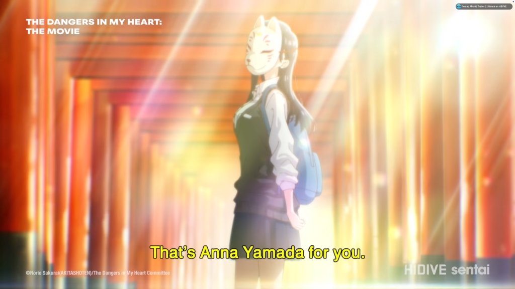 So, where does that leave us with The Dangers In My Heart: The Movie? Well, here’s the thing. If you are brand new to the franchise—I mean, you have NEVER seen the original show before—I would recommend watching it if you want a short, cliff notes breakdown. This is a really good way to get an idea of the kind of relationship Kyotaro and Anna have and how it developed in a quick, easily consumed, trimmed-down format. Just don’t expect to see as much individual character development or world-building as you would get in the series. However, if you have already gone through the series, there’s not much new here to warrant going out of your way to watch it in a theatre. As much as it pains me to say this as a fan of this series who loves and adores these characters and the story of their romance and growth, I wouldn’t recommend this one. Kyo and Anna deserve so much better than a compilation movie. Hate to say it, but this movie really could’ve been an email.