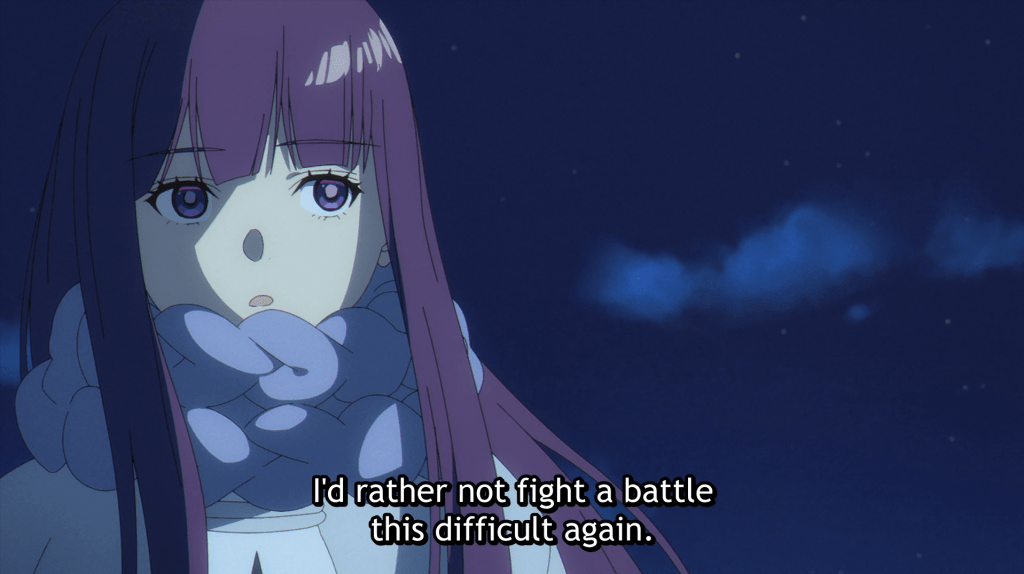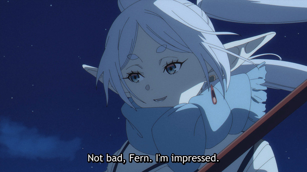 You would think that by doing so, Frieren is being lazy or contemptuous or unfeeling, like the Deist version of a god who winds the clock and lets the universe go as it will. But Frieren has demonstrated she is not that. She loves Fern and Stark. But when Fern expresses doubt as to whether or not she can defeat Hemmung, Frieren doesn’t jump in to assist. She simply tells Fern that yes, she can.