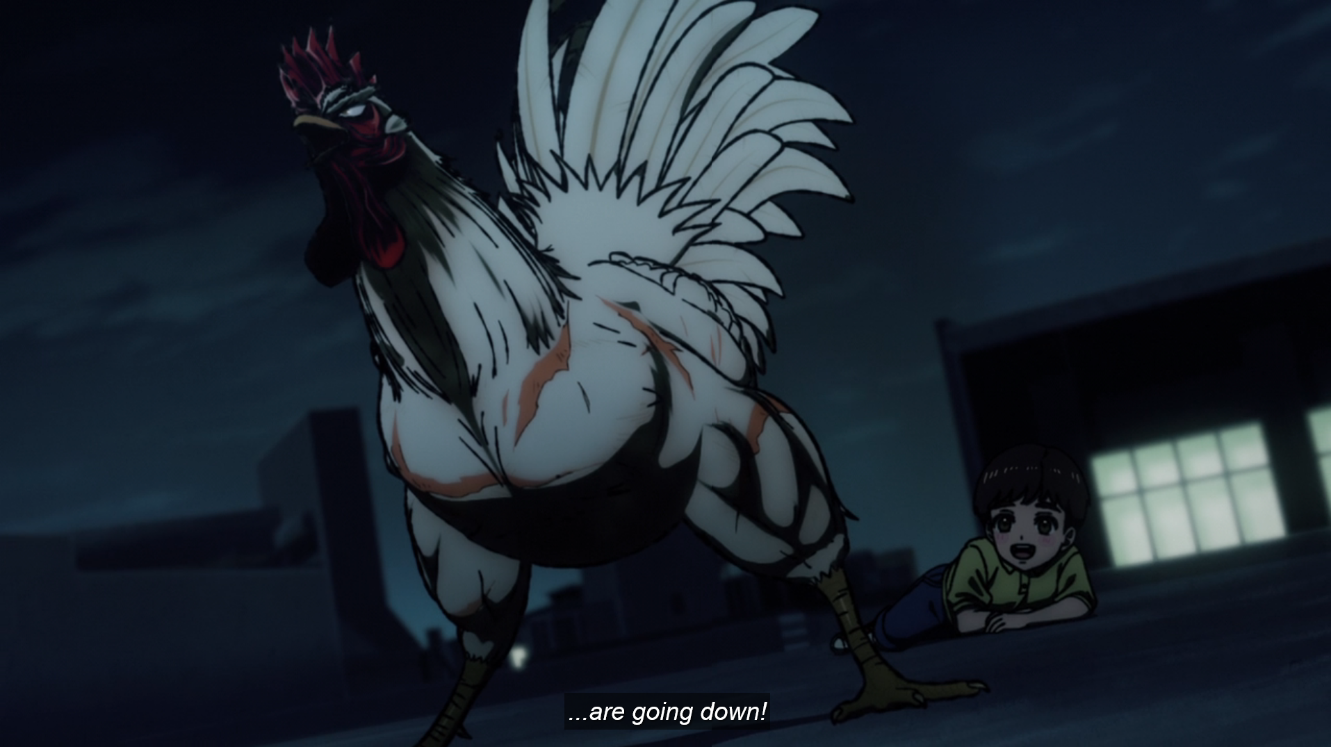 …I’m not sure this silly show really works with the heart it’s trying to convey; while the rooster is a good character, one that’s easy to root for, I’m not sure I really care much about his quest or the people around him. The jokes are up and down, too; I was not amused, for instance, by the sex scene near the beginning of the episode (yep, really—and with lots of sound effects). And ultimately, it’s tough for a series like this to keep the momentum going over time (see One Punch Man). And if your opening episode isn’t pure delight—and Rooster Fighter’s initial offering is more of a C+ or B- for me—you hardly stand a chance at making a series that’s basically a one-trick pony (er, rooster) into something great.