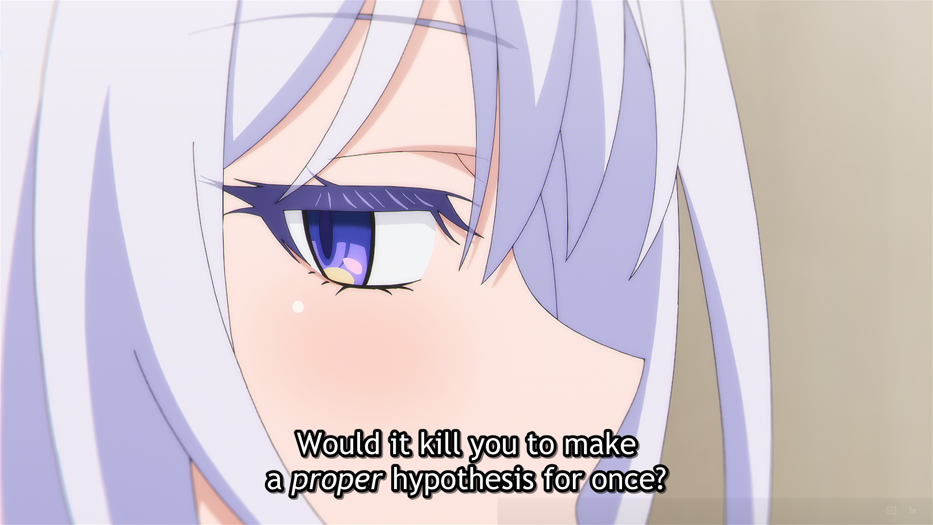 The mystery in this first case doesn’t grab my attention at all—conspiracy at sea involving a film producer, an actress, a cat, and a clown? Okay, I guess. The animation isn’t very good either. I do like the pairing of Sakuya and Lilithea—they have a nice chemistry together—and their voice performances are strong. But beyond that, I’m just not interested, even after the twist at the end of the episode, which isn’t a surprise at all if you’ve read a synopsis of the series (you might have just guessed it too, by reading the show’s title). The mystery is that these detective anime keep getting made at all.