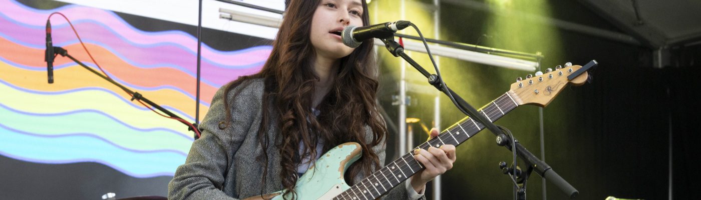 As the crowds began to assemble, finding seating on the field in front of the stage or lining up to buy food from vendors, I caught sight of a musician sitting cross-legged at the side of the festival stage, tuning her guitar. I immediately recognized this wispy, pretty young woman and wondered if others knew that she was about to go on stage and open the showcase. If they didn’t, they’d soon know her by her melodic tunes and powerful, precise voice.