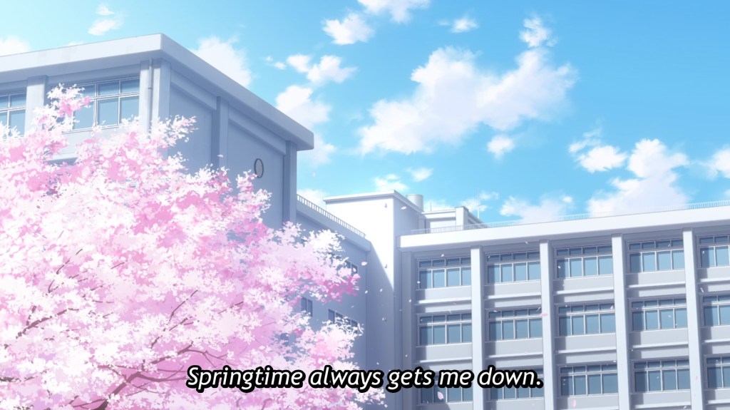At a point in this episode, Maehara’s mother comically asks him if the friend he speaks about is real or imaginary. Ouch, Mom. But something about that comment gave voice to a nagging feeling I’ve been feeling all episode. Is all this really happening? Would a popular girl suddenly invite herself to the movie night of a high school outcast? Does this slim beauty really enjoy weekly shark movies, video games, and pizza? Or is it Maehara she’s after? And, if so, why not ask him out? The questions just keep piling up. Was she won over by his completely honest self-introduction, perhaps? Why the secrecy? Am I just overthinking all this? My Cartesian uncertainty is not helped by the fact that we go straight from their encounter at the store to their third movie night. Then, all at once, they are so close that she can playfully tickle him! How? Maehara himself seems happy and a tad incredulous that all this is really happening to him. I’ll say I’m intrigued by this story, at least for now. I’m also enjoying the beautiful spring backgrounds, the music, the sounds. I guess I’ll have to come back for answers next week. Until then, here I am, scratching my head.