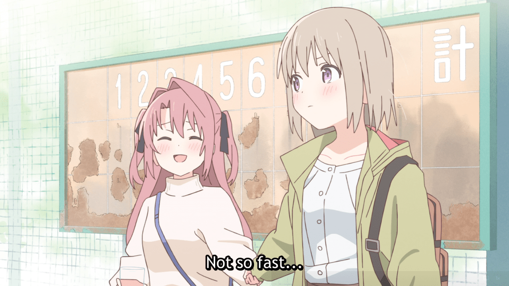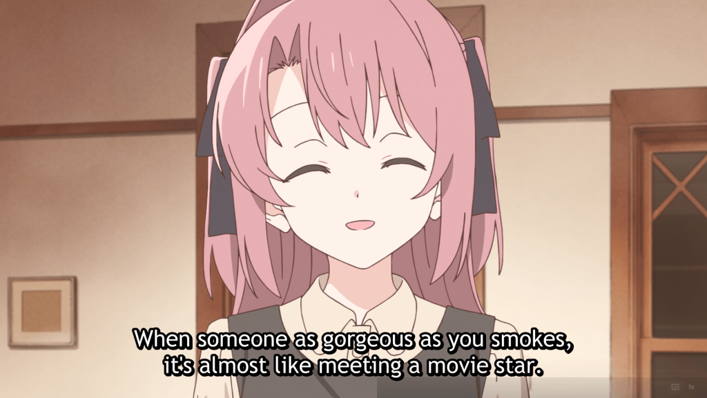 Botan Kamiina Fully Blossoms When Drunk has an extremely cute aesthetic—beautiful, soft colors are used, the girls are cute (and occasionally have very kawaii reactions), and there’s a ton of blushing going on. But I found episode one of this yuri series to be disingenuous and off-putting. It begins and ends with drinking. Anime is full of female characters who drink—usually for laughs—but because scenes don’t tend to linger too long on them, we as an audience don’t have to think about their sometimes copious alcohol consumption. There isn’t drunkenness happening here in this series so far, but I’m not keen on how Botan becomes extra aggressive and loud—as if she is drunk—after about two sips of whatever she drinks, and then aggressively flirts with whatever girl is in her line of sight. The series wants to have its whiskey and drink it too, yet tries to use alcohol to add cuteness, humor, and romance to the series without making it feel like a vice (the same for smoking, by the way)—but when the whole show is centered on drinking, it just doesn’t work. The vice is always before you. And the cute vibes and themes about drinking helping these girls grow in their maturity and in relationships with one another just add to the feeling of dishonesty. Also, the show is kind of boring. This is a big “no” for me.