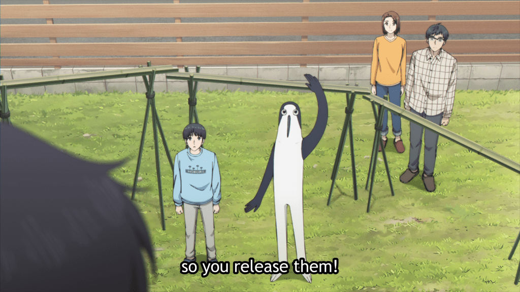 Arata Kouda is on his way home from school when he sees a strange penguin/alien-looking creature stealing coins from a vending machine. He is mildly surprised, but quickly makes friends with the eponymous Russian bird. His parents and older brother are a little less accepting, at least initially, of Kujima. In particular, Suguru, the older brother, is not very happy with an extra source of disturbance in the home. He prefers the house to be completely quiet so he can focus on his studies, which causes him to be at odds with Kujima. However, over the course of the episode, Kouda’s parents slowly warm up to the newcomer, and Kujima is very appreciate of the Japanese food he gets to enjoy. It might be just a matter of time until Kujima and Suguru become friends too.